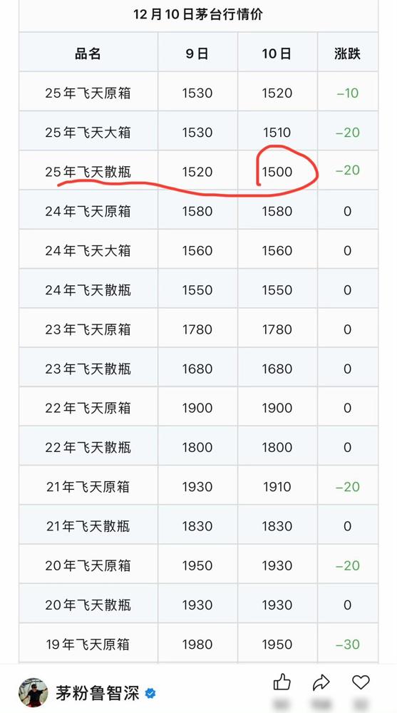 今天2025年12月10日, 飞天茅台目前跌到1500元了, 今天2025年12月10日, 飞天茅台目前跌到1500元了, 差不多等同茅台公司定的1499元官方零售价了。 这个价格确实有点没想到。以前抢都抢不到,现在居然快跌破官价了。 感觉茅台的神话是不是要结束了?以前一瓶难求,价格炒上天。现在随便就能按官价买到?这变化也太快了。 看看网上数据,整个茅台系列酒都在跌。不只是飞天,其他生肖酒、精品茅台也撑不住了。市场上货好像变多了,但买的人没以前那么疯狂了。 为什么会跌这么狠?听说跟年轻人喝酒习惯变了有关系。现在很多年轻人聚会,更爱喝点啤酒、精酿,或者低度酒。对白酒,特别是高端白酒,兴趣没那么大了。还有一个原因,可能就是之前炒得太高,泡沫总归要破的。 过年还会买茅台吗?要是旗舰店真能1499随便买,估计不少人会动心。毕竟过年过节,摆上一瓶茅台还是有面子的。但也就是喝个气氛,指望它升值赚钱,现在看是难了。 说到底,酒终究是拿来喝的。以前那种囤着等涨价的心态,该变变了。价格回归理性,对真正想喝酒的人来说是好事。 东西的价值,不应该只由价格来决定。适合自己、用得上的,才是最好的。 MCN双量进阶计划