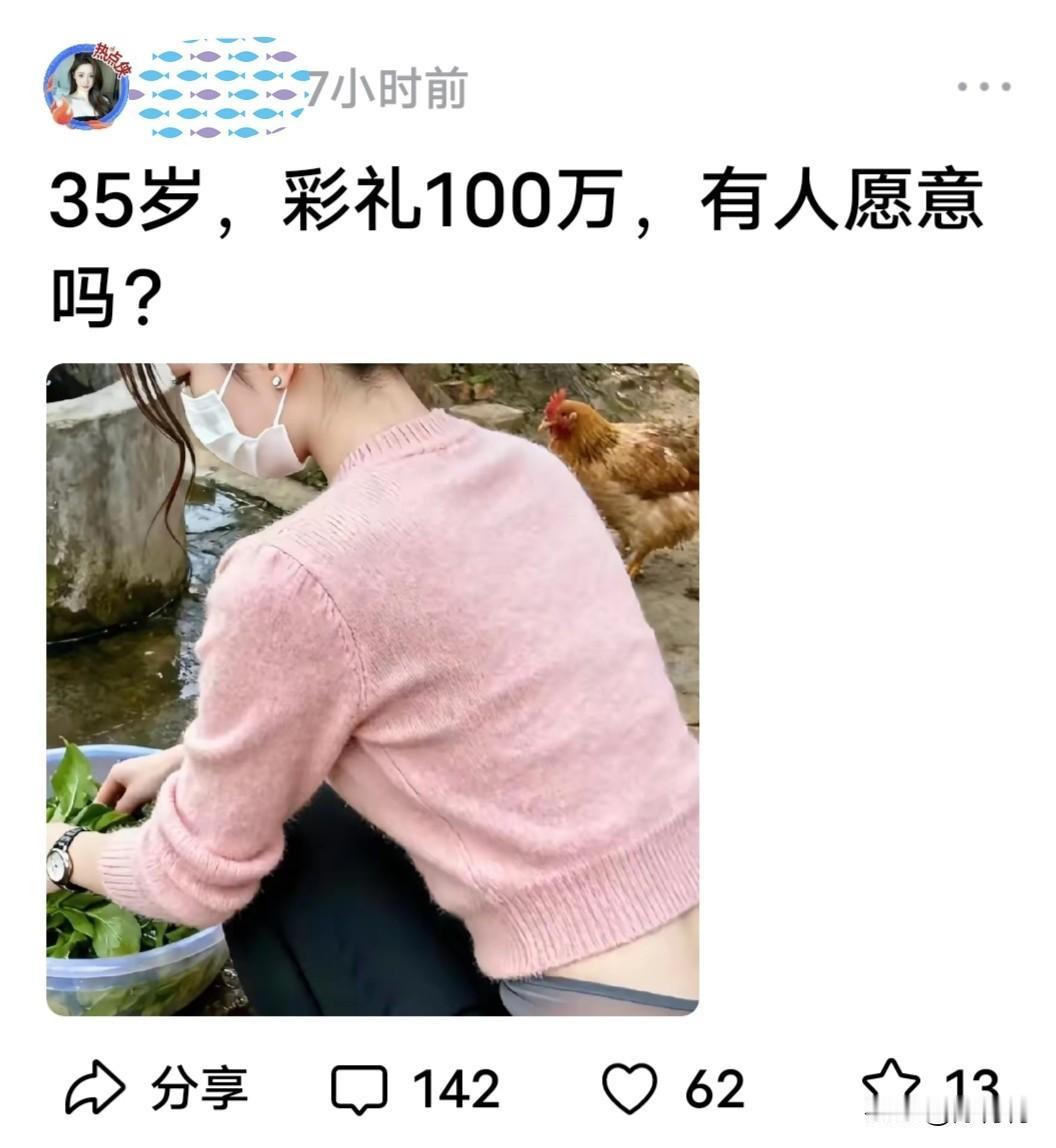 美女寻找老公,条件如下,“35岁,彩礼100万,有人愿意吗?”感情是基础,成功靠缘分。婚姻哪有明码标价的?这样能找到幸福吗? 从镜头看女孩应该是农村的,给人第一眼缘属于美女小姐姐,可惜戴着口罩没能看清楚漂亮脸蛋。 35岁年龄,也是老大不小了,超过谈婚论嫁的地步,如果自身优势不明显,想找到心仪的白马王子,那要费点周折。 起码彩礼要的高,一百万元不是人人都能拿得起,拿得起的可能老板,有钱人谁不找小姑娘? 有网友说,“初恋给了同学,初次给了前男友,初婚给了前老公,压力给接班侠。” “关键是拿出100万的,不一定能够看上她,拿不出的她看不上,这处境有点难啊。” “婚姻是感情方面的事,是心灵碰出的火花,这么明码标价,有火花吗?”大龄女择偶 找对象感悟 女生找对象 找真爱的剩女
