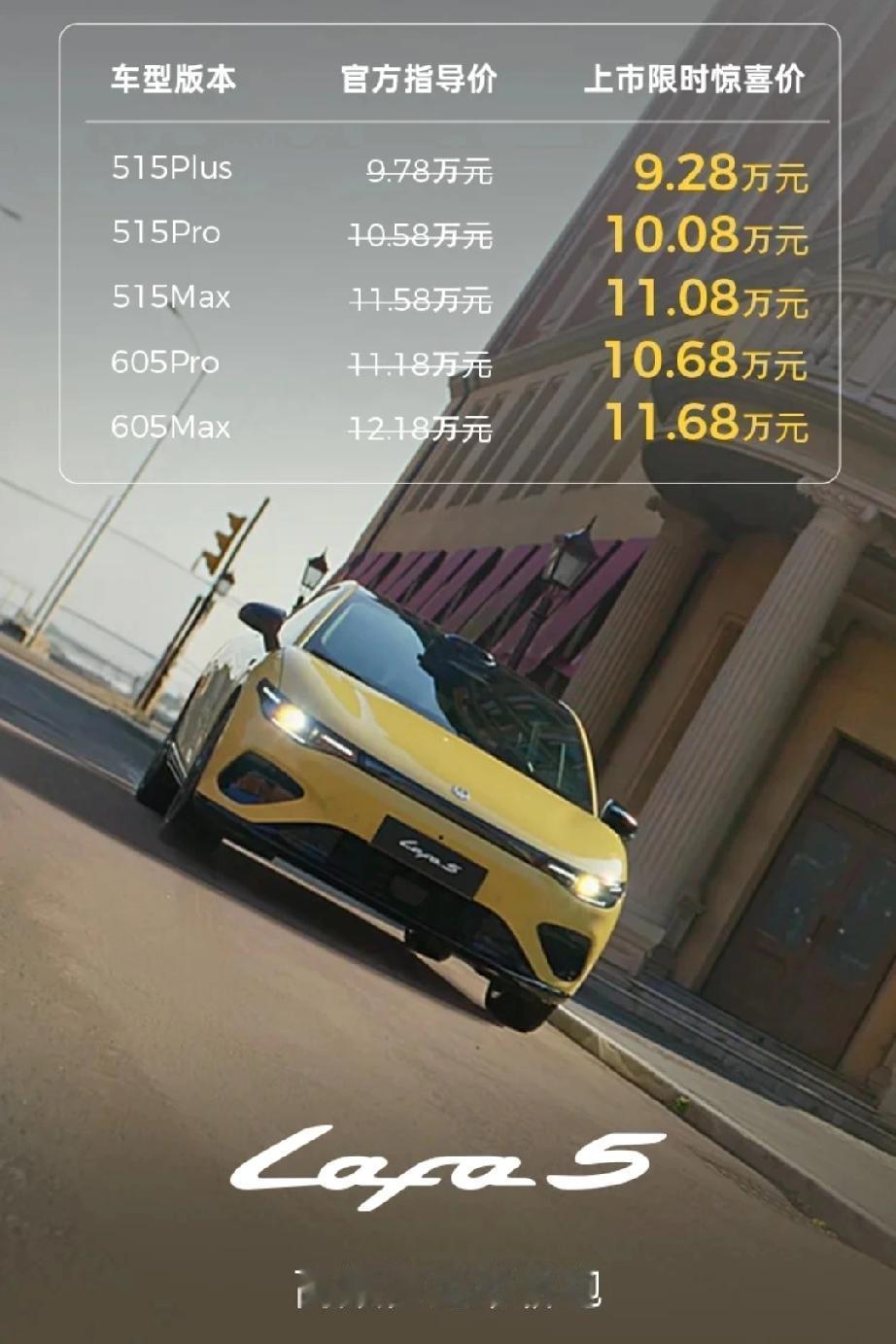 零跑 Lafa 5,满足年轻消费者梦想之车,在 2025 广州国际车展上,零跑 Lafa 5 宛如一颗耀眼的新星,吸引着众多年轻消费者的目光。它以独特的魅力,满足了年轻人对于汽车的多重期待,成为 10 万级纯电轿跑的标杆。 对于年轻消费者而言,购车时常常陷入两难境地。既渴望车辆拥有个性的外观、出色的性能,又希望价格亲民、实用可靠。而零跑 Lafa 5 的出现,打破了这种妥协的局面。它用 10 万级的预算,为消费者带来了 20 万级的配置、颜值、智能和安全。 从外观设计来看,零跑 Lafa 5 独具匠心。经典的“钢炮”造型、溜背式扰流板、隐藏式门把手与无框车门等设计元素,彰显出强烈的个性与时尚感,满足了年轻人对于独特审美的追求。 在性能方面,它更是表现卓越。高功率版电机最大功率 160KW,百公里加速仅需 6.4 秒,能带来畅快的加速体验;低功率版电机最大功率 132KW,也足以满足日常出行需求。这种动力表现,让年轻人在驾驶过程中感受到速度与激情。 续航能力也是零跑 Lafa 5 的一大亮点。配备 56.2kWh、67.1kWh 的电池包,CLTC 纯电续航里程分别可达 515km、605km,解决了消费者的续航焦虑问题,让出行更加自由。 值得一提的是,目前零跑 Lafa 5 推出了限时惊喜价和多重权益,截止日期为 2025 年 12 月 31 日。这无疑为年轻消费者提供了一个绝佳的购车时机。 零跑 Lafa 5 真正做到了让年轻人不用在“个性与实用”“性能与价格”之间妥协,实现了他们对于理想座驾的追求。如果你也想拥有一款能够“自己定义路”的座驾,不妨抓住这个机会,深入了解零跑 Lafa 5。