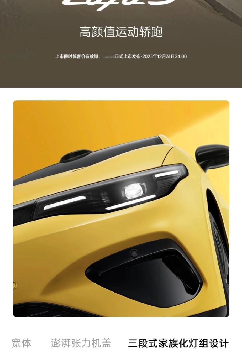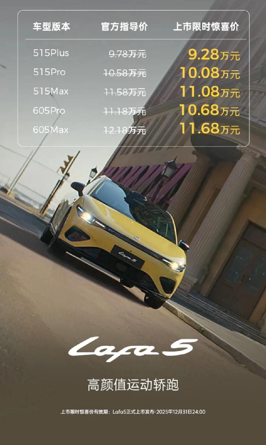 零跑 Lafa 5,从挫折中驶向梦想的赛道,在广州国际车展的璀璨舞台上,一辆黄色小车闪耀登场,它就是零跑 Lafa 5,宛如一道灵动的光,刹那间点燃了人们的热情。 初见 Lafa 5,经典「钢炮」造型跃入眼帘,短前后悬、高腰线、溜背式扰流板,每一处线条都流淌着运动的韵律。61.4°大倾角前风挡、19 英寸运动轮毂与低趴姿态,系统性的运动基因注入,让它从外观就散发着不羁的活力。隐藏式门把手与无框车门,更是为这份动感增添了几分简洁与高级。 它的车灯设计犹如点睛之笔,贯穿式灯带横贯车头,三点式日行灯勾勒出独特「眼神」,远近光灯组居中,配合前凸车鼻与黑色前唇,未动先「冲」,仿佛在赛道上随时准备一骑绝尘。若选择「Ultra」版本,专属运动前唇、全车空气动力学下包围与显眼尾翼,将运动感升华至赛道感。 性能上,Lafa 5 毫不逊色。160kW 后驱电机,240N・m 峰值扭矩,0 - 100km/h 加速最快 6.4 秒。基于 800V 高压架构,56.2kWh、67.1kWh 磷酸铁锂电池,CLTC 工况续航分别达 515km 与 605km,5 分钟补充 200km 续航,15 分钟从 10%充至 80%,实力强劲。 走进车内,简约科技风格扑面而来,速域紫、驰影灰、竞速灰三种配色任你选择。黑化哑光枪灰镀铬饰件降低反光干扰,双辐式平底方向盘搭配怀档结构,真皮与仿麂皮混搭材质压印赛道纹理,顶篷内嵌专属标识,细节之处尽显用心。 零跑的发展并非一帆风顺。6 年前,首款车型 S01 折戟沉沙,但零跑吃一堑长一智,转向主流家用市场,一步一个脚印成为新势力销冠。如今,零跑要圆轿跑梦,Lafa 5 应运而生,它不仅是一款车,更是零跑从挫折中崛起的见证,带着梦想与激情,驶向更广阔的未来。