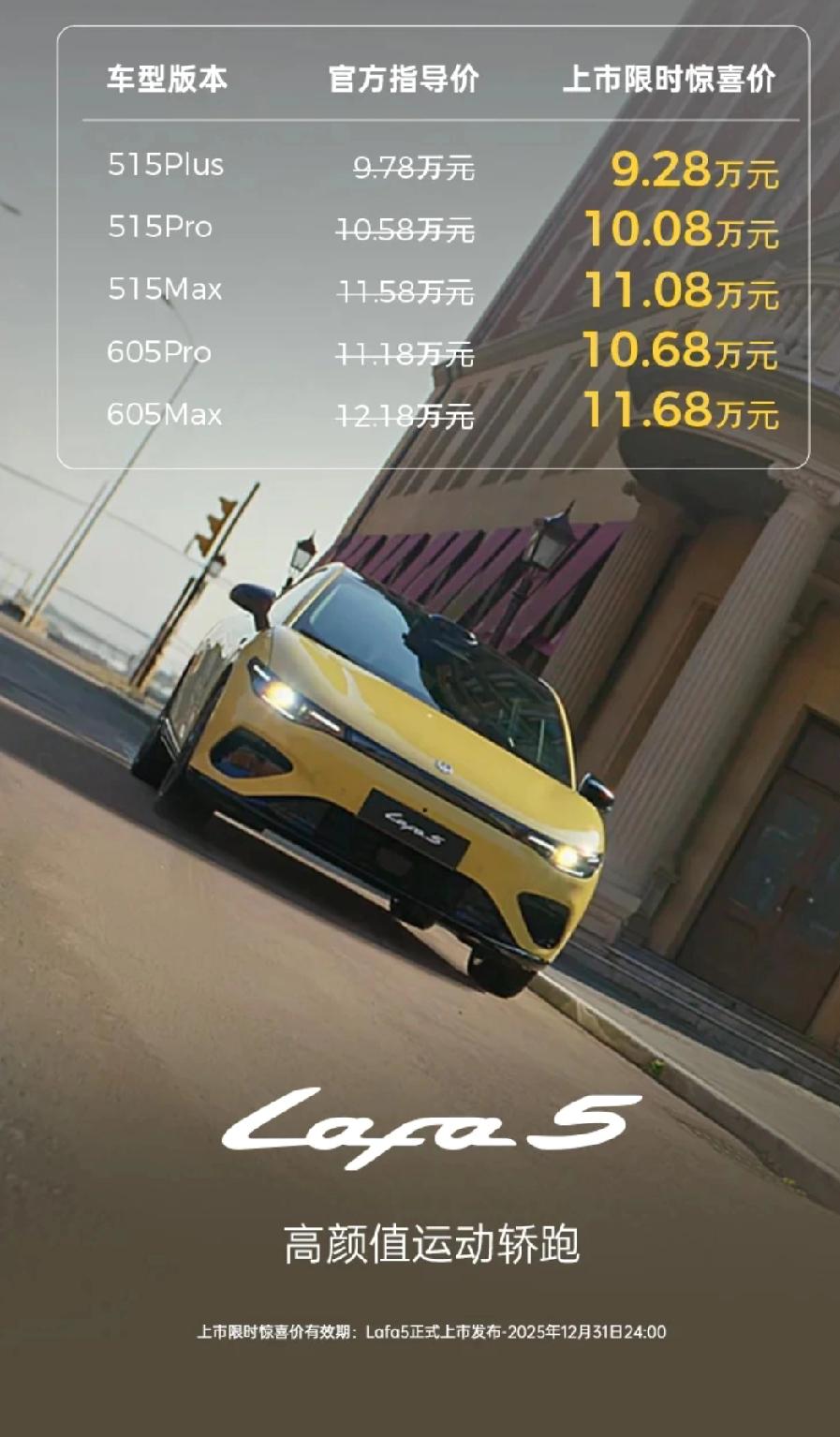 零跑 Lafa 5,年轻人的理想之车,在当下的汽车市场中,年轻消费者的需求愈发成为车企关注的焦点。他们追求个性、性能与科技感,渴望一款能真正契合自身生活态度的座驾。而零跑 Lafa 5 的出现,无疑精准命中了年轻消费者的痛点,堪称懂年轻人的诚意之作。 零跑 Lafa 5 一亮相便以其独特的外观设计吸引众人目光。经典的“钢炮”造型,搭配短前后悬、高腰线和溜背式扰流板,61.4°的大倾角前风挡与 19 英寸运动轮毂、低趴姿态,让它浑身散发着运动基因。隐藏式门把手与无框车门的加入,更是提升了车辆的高级感,在同级别车型中脱颖而出。独特的车灯设计,贯穿式灯带与三点式日行灯相呼应,远近光灯组居中,配合前凸车鼻与黑色前唇,未动先“冲”,辨识度极高。 性能方面,Lafa 5 同样表现卓越。单电机后驱版本零百加速最快可达 6.4 秒,对于一台 10 万左右的两厢紧凑型电动车来说,这样的成绩着实超纲。其配备的峰值功率 160kW 的后驱电机,峰值扭矩 240N·m,带来强烈的驾驶激情和推背感。基于 800V 高压架构打造,5 分钟补充 200km 续航,15 分钟将电量从 10%充至 80%,高效的充电速度解决了充电焦虑问题,为出行提供了极大便利。 走进车内,简约科技风格扑面而来。速域紫、驰影灰、竞速灰三种配色满足个性化需求,全系标配的黑化哑光枪灰镀铬饰件降低了反光干扰。8.8 英寸全液晶仪表与 14.6 英寸中控屏的组合,内置骁龙 8295 P 座舱芯片,如同百万级豪车的最强大脑。仿麂皮超纤绒加纳帕真皮座舱,搭配双辐式平底方向盘、怀档结构,以及压印赛道纹理的内饰材质和内嵌专属标识的顶篷,细节之处尽显品质。 此外,车内 50 瓦手机无线充电、副驾驶魔术扩展岛台、12 扬声器加无麦 k 歌、1.02 平米超大全景天幕等亮点配置,还有可个性化设置的零跑灵动键,都为驾乘体验增添了乐趣。 预售 10.58 万元的价格区间,结合丰富的配置、出色的性能和独特的设计,零跑 Lafa 5 性价比极高。它让年轻消费者无需在“个性与实用”“性能与价格”之间纠结,真正实现了用 10 万级预算享受 20 万级的体验。 零跑 Lafa 5 以其全方位的优势,成为了年轻人购车的不二之选,它不仅是一辆车,更是年轻人生活态度和个性追求的延伸。