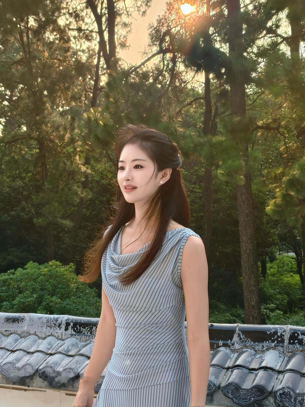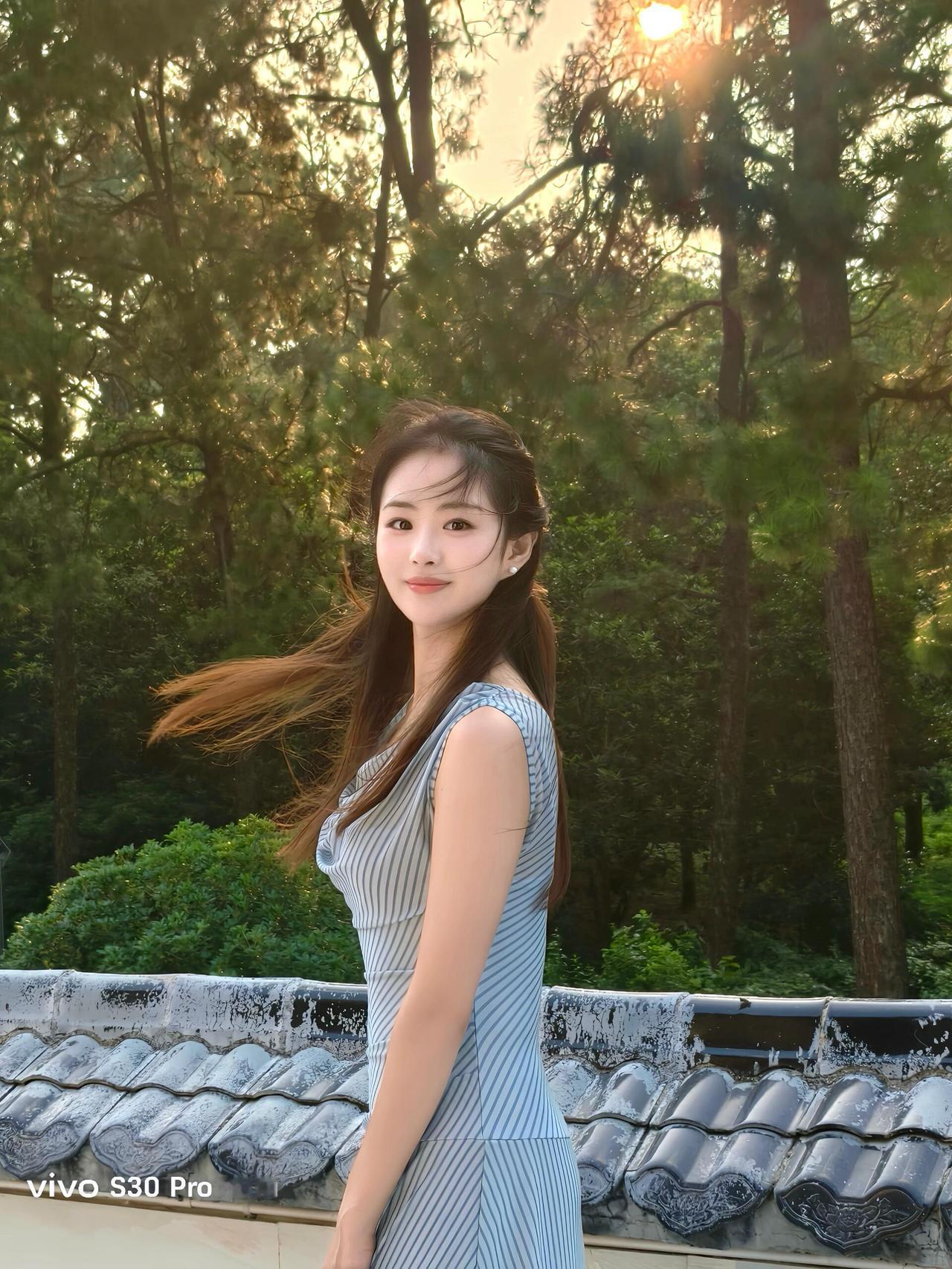 晚风吻过檐角时 作者/朱珠 当落日把松针捻成金箔 晚风先一步吻过青灰的檐角 她站在时光的褶皱里 像一尾被风轻轻托起的蓝纹鱼 条纹裙裾垂落,是未拆封的溪流 兜住了半盏黄昏,和松涛的私语 指尖掠过耳侧的刹那 长发漫过肩头,如松间漏下的光 不疾不徐,拂开夏末的余温 她的目光越过层叠的绿意 落向落日沉下去的方向 那里有云絮在林间摇晃 像谁揉碎了一捧温柔的糖 檐瓦的纹路刻着旧时光的凉 而她是鲜活的,是晚风的偏旁 是松针与落日私藏的温柔 风掀起裙边,也掀起发梢 每一缕飘动的发丝 都在和黄昏说悄悄话 不必追赶什么,不必奔赴远方 站在这里就好 让落日的光漫过眉骨 让松风穿过指缝 让这一刻的温柔 长成林间永不褪色的模样 暮色漫上来时 她仍是那个被晚风偏爱的人 檐角的光影落在裙上 像给时光系了一枚浅蓝色的纽扣 把松涛、落日、晚风 都妥帖地收进这一方小小天地 不必言语,不必张扬 只做自己,就胜过所有琳琅晚风落叶 晚风吹过树叶 黄昏晚风 晚风 晚风吹过耳旁 晚风荡过林间梢 秋天落在笔尖