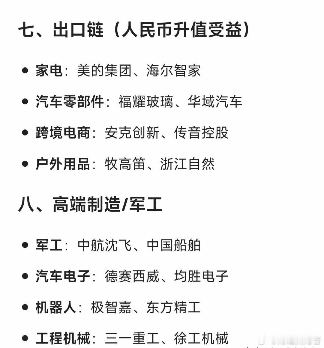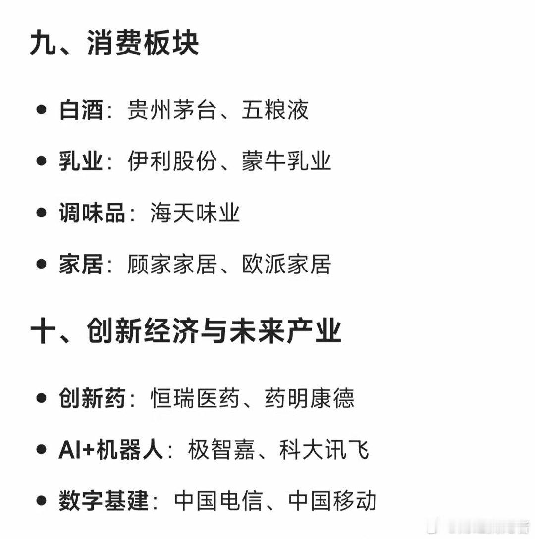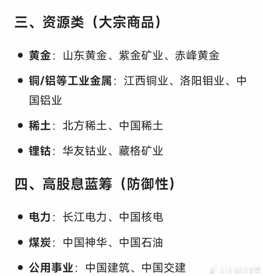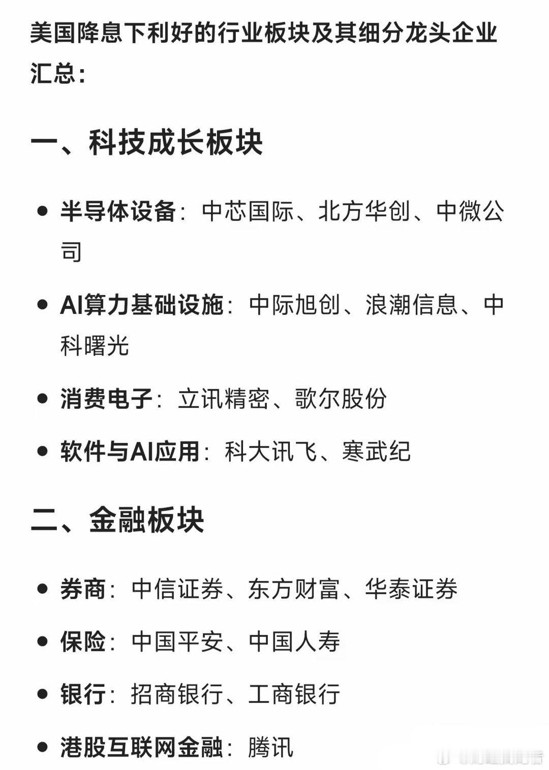 美联储降息周期核心受益行业及细分龙头全景图美联储开启降息周期后,全球流动性宽松、美元走弱、外资回流新兴市场成为主线逻辑,A股多领域龙头企业将直接受益。以下是覆盖成长、周期、消费、制造等赛道的受益行业及核心标的汇总,精准匹配降息环境下的投资机会:一、科技成长板块(流动性宽松+估值修复核心方向)• 半导体设备:中芯国际、北方华创、中微公司(国产替代+AI算力需求双重驱动)• AI算力基础设施:中际旭创、浪潮信息、中科曙光(全球算力建设热潮直接受益)• 消费电子:立讯精密、歌尔股份(终端需求回暖+海外订单修复)• 软件与AI应用:科大讯飞、寒武纪(技术创新+场景落地加速)二、金融板块(外资配置+市场活跃度提升受益)• 券商:中信证券、东方财富、华泰证券(交易活跃度提升+投行业务放量)• 保险:中国平安、中国人寿(资产端估值修复+长端利率企稳)• 银行:招商银行、工商银行(高股息属性+外资回流配置偏好)• 港股互联网金融:腾讯(生态协同+政策环境改善)三、资源类(大宗商品)(美元走弱+通胀预期支撑)• 黄金:山东黄金、紫金矿业、赤峰黄金(避险需求+实际利率下行双重利好)• 铜/铝等工业金属:江西铜业、洛阳钼业、中国铝业(全球经济复苏+新能源需求拉动)• 稀土:北方稀土、中国稀土(人民币结算占比提升+定价权增强)• 锂钴:华友钴业、藏格矿业(新能源产业链上游核心原料)四、高股息蓝筹(防御性配置优选)• 电力:长江电力、中国核电(业绩稳定+分红比例高)• 煤炭:中国神华、中国石油(能源保供+现金流充裕)• 公用事业:中国建筑、中国交建(基建需求+人民币贷款融资优势)五、医药生物板块(成长确定性+外资青睐)• 创新药:恒瑞医药、百济神州(研发管线兑现+出海预期)• CXO:药明康德、康龙化成、凯莱英(全球产业链分工+订单稳定性强)• 医疗器械:迈瑞医疗(国产替代+海外市场拓展)• 生物制药:华兰生物、同仁堂(消费升级+品牌壁垒深厚)六、新能源板块(全球需求+成本优势)• 动力电池:宁德时代、比亚迪(全球装机量领先+技术迭代)• 光伏/储能:隆基绿能、阳光电源、通威股份(人民币结算降本+海外装机放量)• 新能源汽车:比亚迪、赛力斯(出口增长+产业链一体化优势)七、出口链(人民币升值直接受益)• 家电:美的集团、海尔智家(海外收入占比高+汇兑收益改善)• 汽车零部件:福耀玻璃、华域汽车(全球供应链份额提升+汇率稳定红利)• 跨境电商:安克创新、传音控股(新兴市场拓展+定价优势强化)• 户外用品:牧高笛、浙江自然(海外消费复苏+产品竞争力提升)八、高端制造/军工(产业升级+需求刚性)• 军工:中航沈飞、中国船舶(国防需求+订单饱满)• 汽车电子:德赛西威、均胜电子(智能化升级+配套全球化)• 机器人:极智嘉、东方精工(工业自动化+技术进口替代)• 工程机械:三一重工、徐工机械(基建补短板+海外出口增长)九、消费板块(外资回流+内需复苏)• 白酒:贵州茅台、五粮液(品牌稀缺性+外资长期配置)• 乳业:伊利股份、蒙牛乳业(消费升级+供需格局优化)• 调味品:海天味业(刚需属性+渠道下沉)• 家居:顾家家居、欧派家居(地产后周期+消费复苏)十、创新经济与未来产业(长期成长主线)• 创新药:恒瑞医药、药明康德(创新驱动+全球竞争力)• AI+机器人:极智嘉、科大讯飞(技术融合+场景落地加速)• 数字基建:中国电信、中国移动(新基建+数据要素核心载体)• 绿色能源:中国海洋石油、中远海控(能源转型+航运周期复苏)上述标的覆盖传统周期、新兴成长、防御消费等多元领域,均为降息周期中兼具业绩支撑与估值弹性的细分龙头,供投资者结合行业景气度与自身配置需求参考。今日看盘上证指数a股