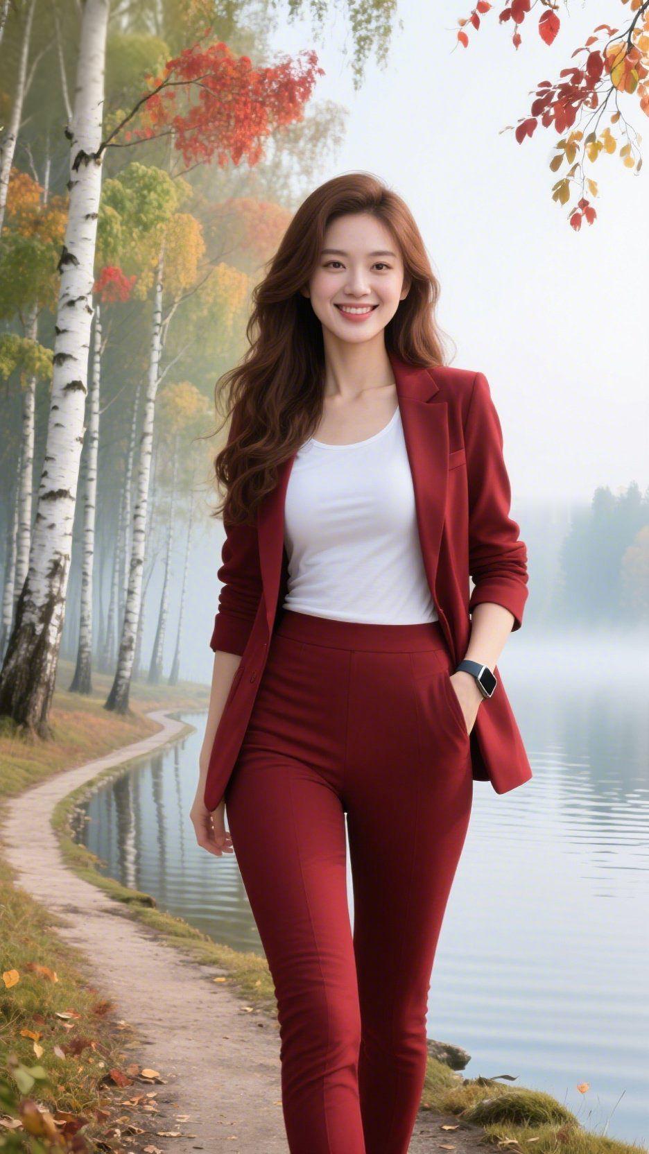 秋径红衣 晨雾裹着秋意漫过湖畔,我踩着铺了半程的金叶,看风把桦树的白摇成细碎的光。 红衣染了枫丛的暖,衬着舒展的轮廓,裤脚擦过带露的草尖时,腕间的表露出浅淡的凉——是把从容的舒展,织进了郊野的柔。 水纹轻晃树影,红叶片片落进眼底,连呼吸都裹了清润的秋气。原来不必追着季节赶路,只一身妥帖的暖,就能让秋光都放缓了脚步。 风掠过发梢时忽然明了:好的时光从不是刻意妆点,是你立在那里,衣角带风,眼底有光,连雾都成了温软的衬景。 秋日随感 穿搭氛围