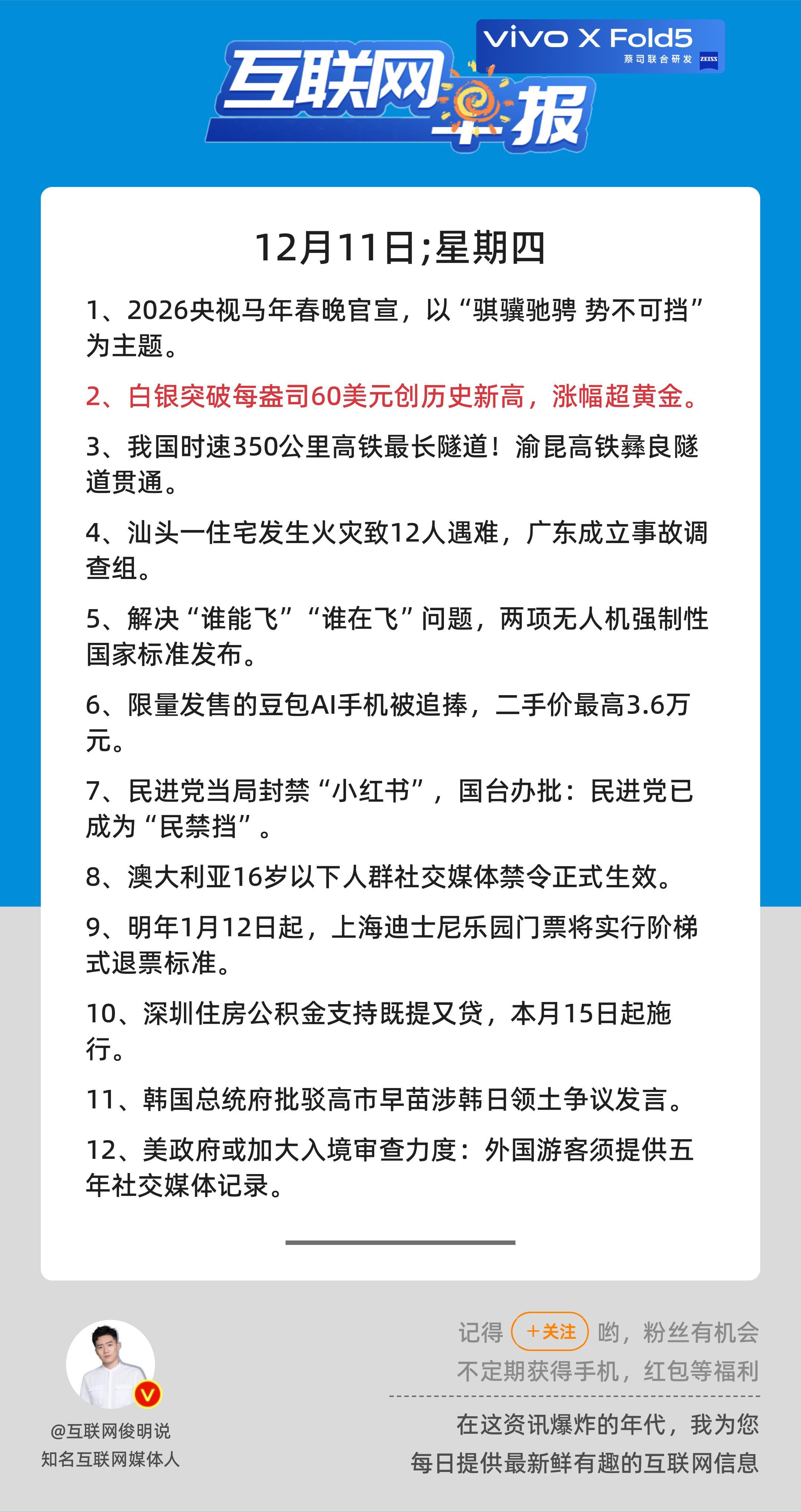 12月11日,星期四,《第2984期》;互联网早报,众览天下事关心第2条:白银突破每盎司60美元创历史新高,涨幅超黄金;早安————————————点击右上方关注每天一分钟众览天下事,互联网早报值得拥有! 更多精彩,欢迎加入粉丝群俊明和他的朋友们