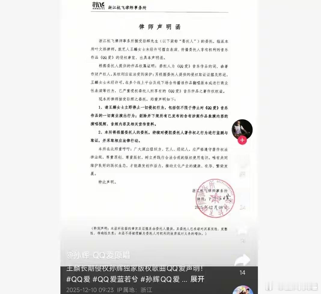 王麟回应被QQ爱曲作者发律师函《QQ爱》这波版权瓜也太突然了吧!陪伴大家快20年的青春神曲,居然闹起纠纷了!曲作者孙辉直接给原唱王麟发了律师函,要求她停了商演里的演唱,还得下架相关视频。王麟已经回应了,说当年公司明明从孙辉那买了版权,她才放心唱、放心宣传,不然哪能有“QQ爱”这首国民神曲啊!而且她现在商演里这首歌占比连五分之一都不到,演出方也会提前清版权,完全没料到会被追责。现在更绝的是,网易云、酷我上都搜不到王麟版本了,只剩孙辉自己和别人的翻唱版,网友都在喊“爷青结”,毕竟没有王麟的声音,那还叫《QQ爱》吗?一边是原唱的青春回忆,一边是曲作者的版权主张,你们站谁?