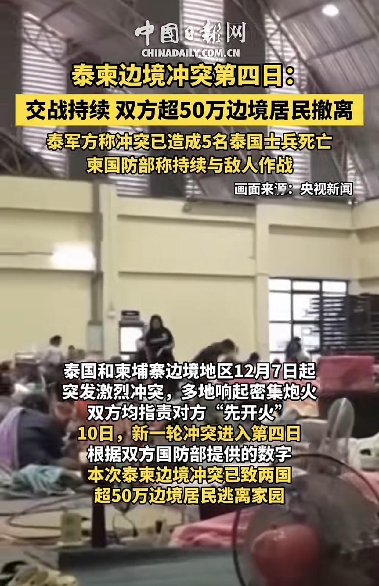 最近泰柬边境的局势也太紧张了! 12月7日起两国突发激烈冲突, 打了4天还没停,双方互相指责对方先开火,场面一度失控。 泰国直接出动了F-16战机空袭柬方目标,柬埔寨也发起反击,双方动用了火箭炮、坦克等重武器,已经造成泰方5名士兵死亡,柬方9名平民丧生、46人受伤。 现在边境彻底乱了,泰国7个府超40万居民撤离,柬埔寨也有12万多人逃去安全区,两国加起来超50万人流离失所。600多所学校被迫停课,16万学生没法上学,还有几十所医院和卫生中心也关了,避难所挤得满满当当。 让人唏嘘的是,两个月前两国还刚签了和平声明,如今却兵戎相见。出门在外安全第一,近期计划去泰柬边境的朋友一定要避开,也希望双方能赶紧停火谈判,别让更多平民遭罪! 泰柬边境冲突 国际热点 民生安全 来源:央视新闻、新华社、央广网