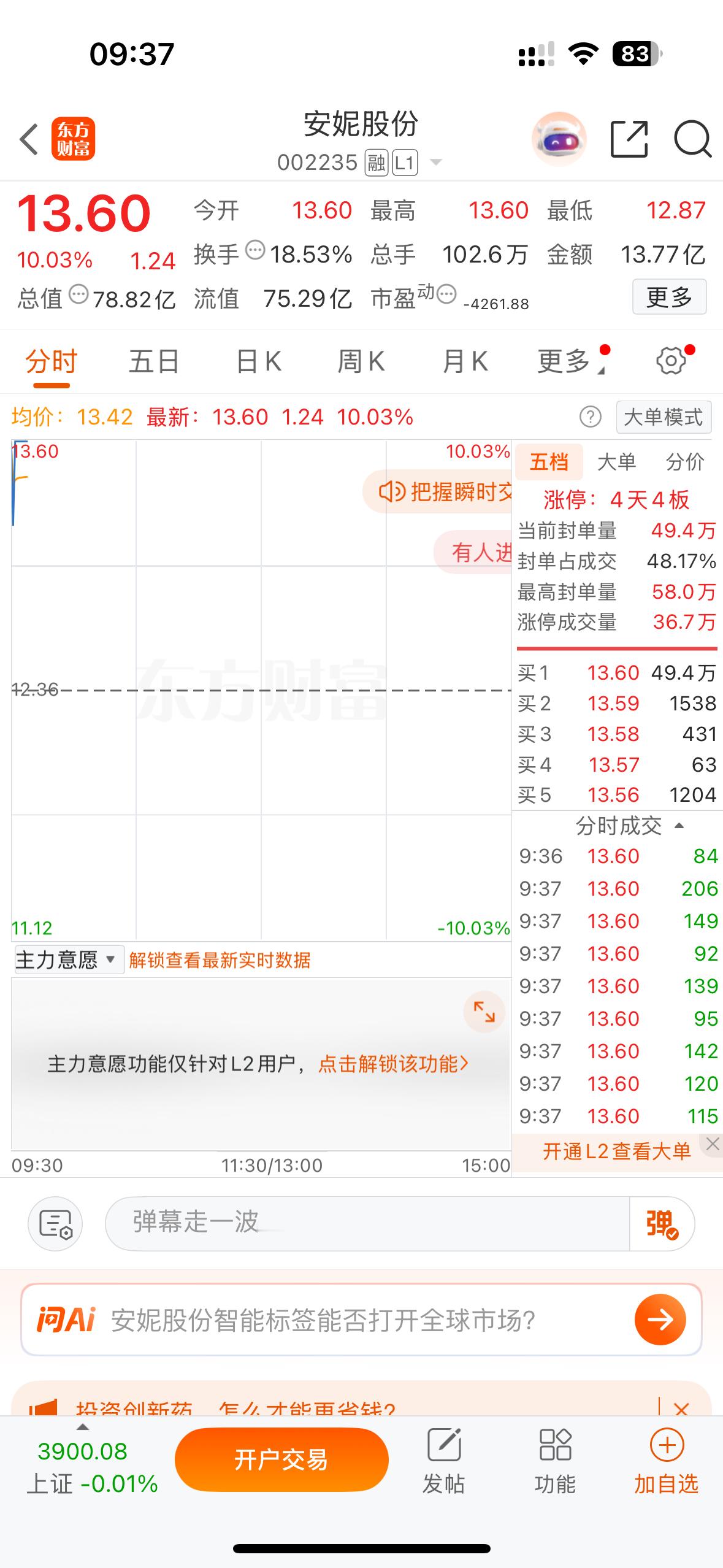 安妮股份002235涨停封板!我今天把余下的仓位都买进了,仓位不多了!这几天我一直都在说,也说了这只票哪天有机会就进,今天给了机会我就上了,大家有跟上吗?