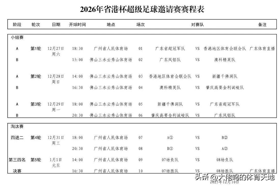 今年省港杯广东队阵容里广州足球元素依然不多,近两场比赛也较难吊起大家足够的热情,但省港杯足球赛 有40多年历史了,绝对是有底蕴的品牌赛事,主办方也非常用心想办法,最终本届赛事特别增加了超级邀请赛,届时主办方将邀请内地及港澳等6支队伍参加。 ——包括广东省超冠军(深圳藝品高队或吴川青年队将于12月14日决出)、佛山“西甲”冠军广东凤铝队、村超全国赛冠军肇庆高要金利诚峻队、新疆千佛洞队、香港地区体育会联会队、澳科精英队。 这应该算是与过往不一样的地方,如果赛事精彩火爆超预期,搞不好之后的省港杯会延续这个邀请赛,拭目以待[加油] 广东队将以十五运会男足U20组比赛亚军队伍——深圳2028俱乐部队为班底组建,老帅王宝山担任主教练,同时还将从相关俱乐部抽调球员加强阵容,包括国安的林良铭、广州豹的侯煜等。 开年第一项省内足球大赛,惯例了,期待届时精彩上演,为2026新赛季拉开帷幕!