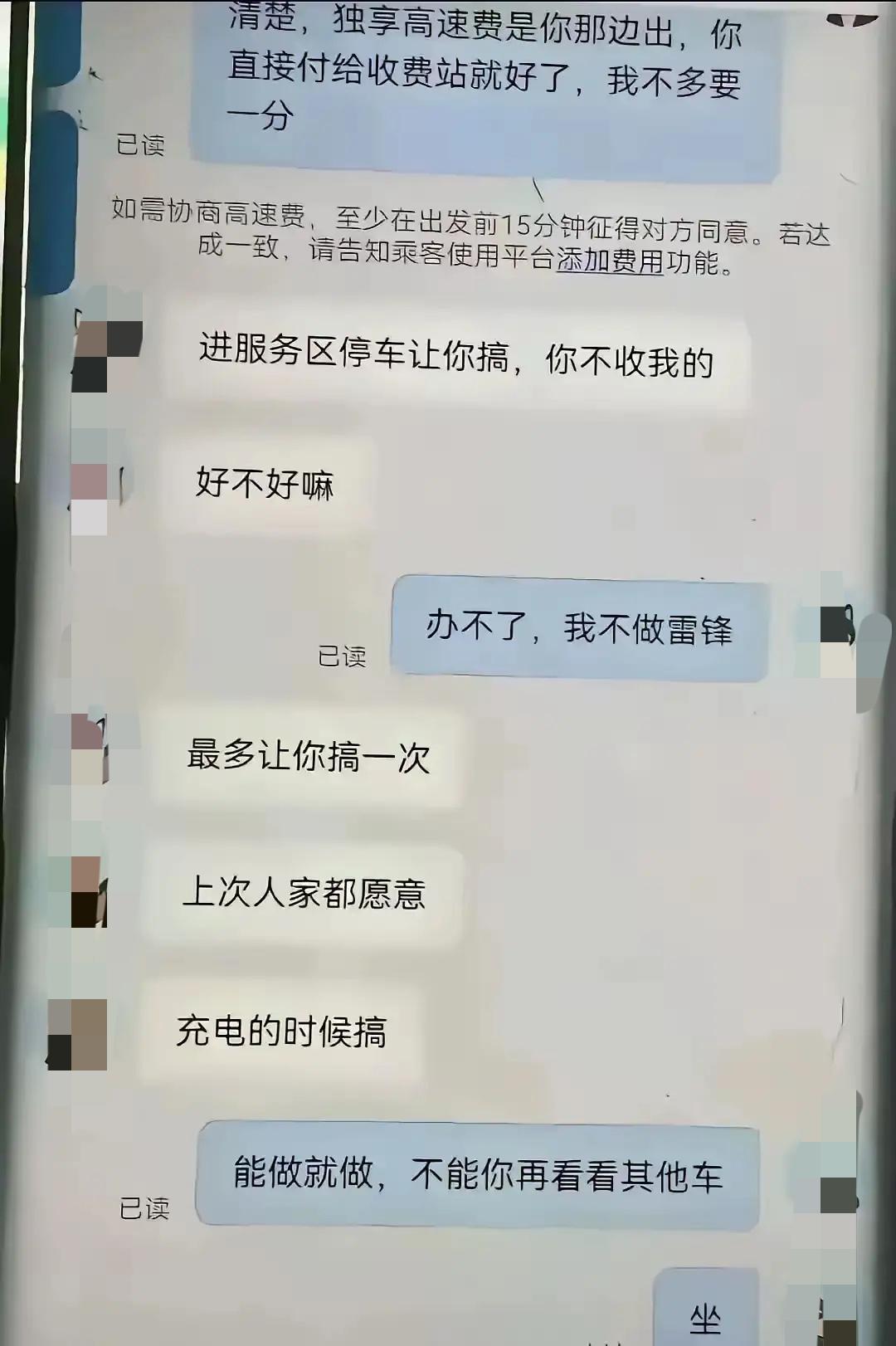 一女子提出一晚上换80的高速费,司机大哥沉默不语。车厢里的空气瞬间凝固,女子这话里的暗示太明显,明眼人都能听出弦外之音。80块高速费,换的哪里是通行便利,分明是突破底线的苟且交易。 司机大哥的沉默,藏着多少不屑与警惕。跑运输风吹日晒赚的都是辛苦钱,每一分都干干净净,绝不会为了这点小钱玷污自己的良心,更不会踩碎做人的底线。 谁都知道跑长途不容易,油费、过路费、车辆损耗压得人喘不过气,但再难也得守着原则。那些想走歪门邪道省钱的人,说到底就是把尊严当筹码,廉价又可悲。 现实里类似的套路并不少见,有人借着拼车、搭顺风车的名义,用小钱诱惑司机达成不正当交易。这种违背公序良俗的行为,不仅恶心人,更是对他人人格的严重践踏。 司机的沉默不是懦弱,而是最有力的拒绝。不反驳不纠缠,却用态度划清了界限,守住了底线。这份清醒和坚定,比任何怒斥都更有力量,值得所有人敬佩。 80块钱不多,却成了人心的试金石。有人为了蝇头小利丢了骨气,有人面对诱惑始终坚守本心。差距不在贫富,而在做人的底线和尊严。 出门在外谁都想省点钱,但省钱必须走正道,不能抱着侥幸心理打歪主意。用不正当手段谋求便利,迟早会为自己的行为付出代价,丢了面子更失了人品。 职业不分高低,尊严人人平等。司机靠双手挣钱养家,光明磊落;女子用暗示换取便利,卑微又低俗。两种选择,两种境界,高下立判一目了然。 别让世俗的浮躁磨平了心底的底线,别为了眼前的小利毁掉自己的人生。每一份干净的收入都值得尊重,每一次坚守原则都无比珍贵。 做人做事,清清白白才最踏实。守住底线,才能行得端正;守住尊严,才能活得坦荡。别让一时的糊涂,留下一辈子的污点。 各位读者你们怎么看?欢迎在评论区讨论。