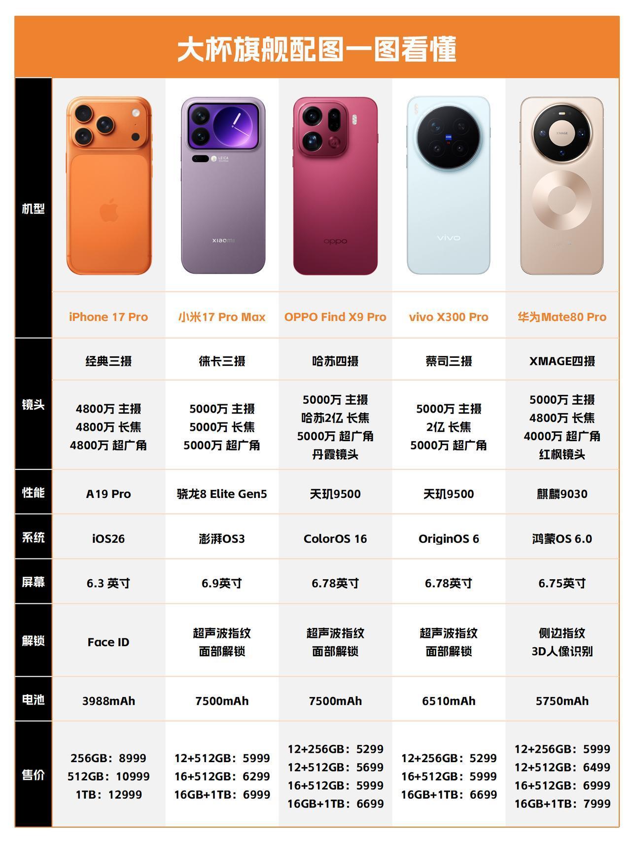 避雷丨一文看懂大杯旗舰优劣点 年底打算换手机的宝子不少,怕踩坑到处做功课🔍这里先帮大家排雷了! 五大新品大杯旗舰,iPhone17 Pro、小米17 Pro Max、OPPO Find X9 Pro、vivo X300 Pro以及华为Mate80 Pro,先看缺点,能接受再看优点👇 ❌iPhone 17 Pro: 主要就是贵,跟其他几款差价都3k了,而且电池跟国产机比也小了点,信号嘛...... ❌小米17 Pro Max: 感觉还是系统差点意思,虽然澎湃3优化好了点,但还有进步空间 ❌OPPO Find X9 Pro: 快充80W,充7500mAh没有百瓦快充那么高速 ❌vivo X300 Pro: 电池比较小,6510mAh虽然比苹果大,但跟其他安卓新旗舰比就不够看了 ❌华为Mate80 Pro: 还是吃亏在性能上了,而且目前鸿蒙生态在丰富度上还是不如iOS和安卓 缺点看完再看优点👇 ✔iPhone 17 Pro: 能够接受价格的话,买苹果那是真的很稳了,iOS稳定流畅,拍照三摄也有升级,录像那更是独一档,果粉换新很舒服 ✔小米17 Pro Max: 今年小米整的背屏设计很有新意,看腻了普通手机的可以完全可以试试,另外小米的骁龙芯片玩游戏也会更舒服点,挺适合年轻人入手的 ✔OPPO Find X9 Pro: 堆料这一块OPPO是有点狠的,哈苏四摄给上了,丹霞色彩还原镜头拍照很出片,2亿长焦拍人拍特写都很不错,电池还给上了7500mAh,ColorOS 16也是安卓流畅代表,各方面都没啥短板,适合大部分人入手 ✔vivo X300 Pro: vivo主要是影像能力突出,主摄、超广角也都很强,再加上蔡司影调的风格,适合喜欢拍照的硬核玩家 ✔华为Mate80 Pro: 华为在外观质感上更显高级,星环设计辨识度很高,同时XMAGE四摄拍照也很强,跟OPPO一样有色彩镜头,很适合商务人士入手 📱大几千的旗舰机,要是买回来用着不合适那就太亏了,先理清优缺点找到适合自己的才不怕踩坑! 看完这些,大家更喜欢哪款大杯旗舰呢?