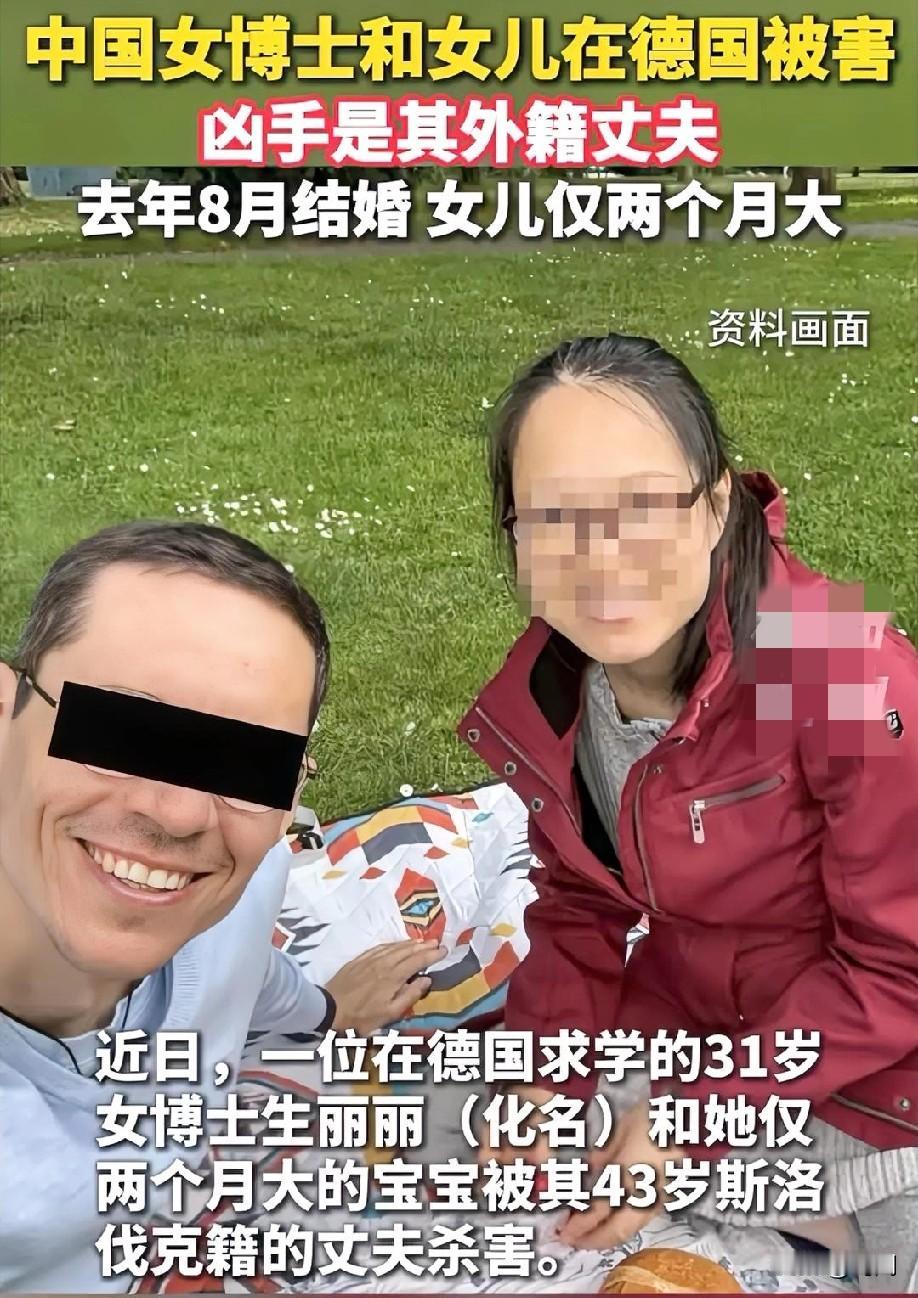 中国女博士和女儿在德国被害! 凶手竟是其外籍丈夫! 警方调查发现,凶手的作案工具竟是斧头和刀具,用斧子好狠毒啊!怎么下得去手呢!男子行凶后自残,当场就承认了杀害妻女!男子43岁,被害女子31岁,他们的女儿只有两个月! 其大学室友介绍“丽丽她于2020年被公派到德国留学,攻读博士学位,家境普通,但学习很刻苦,经常拿奖学金,在读研究生阶段,与其丈夫相识,当时她丈夫是作为交换生到中国的,两人是去德国后才确定恋爱关系,去年8月结婚的,我们都为她感到开心,可惜一年半就发生这样的事情” 其大学班长组建群聊,筹集资金给丽丽父母筹集赴德国的路费!这父母是啥心情呢,盼着盼着却听到了噩耗! 丽丽作为公派留学生!本来和国家约定了要报效祖国的,却决定嫁给了外国人,这真是不想回国了……还生在普通家庭!本来是人才啊,苦读寒窗数十载!却遇人不淑,这一生的命运就被改变了,令人唏嘘……唉!尊重他人选择及命运吧!