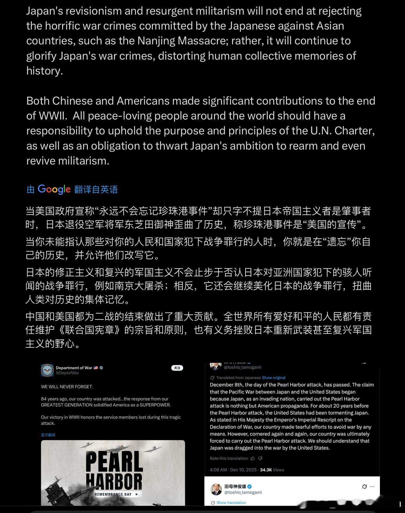 现在压力来到美国身上了。美国战争部在纪念“珍珠港事件”时只字不提日本才是始作俑者,已经被不少人说为了政治放弃原则了。现在连过气的退休日本军官田母神俊雄都敢蹬鼻子上脸,说“珍珠港事件是美国的宣传”,意图进一步篡改历史了。早就说了,日本的历史修正主义者和军国主义者绝不会仅仅止步于否认日本二战在亚洲国家的罪行,只要有可能,他们会想方设法篡改历史,清除一切不利于他们的真相和事实。现在还有求于美国,就敢这么明目张胆篡改历史。可想而知未来会如何了。世界上一切爱好和平的人民,都有责任维护联合国宪章宗旨和原则,都有义务阻止日本再军事化甚至企图复活军国主义的野心。美国人也不例外。