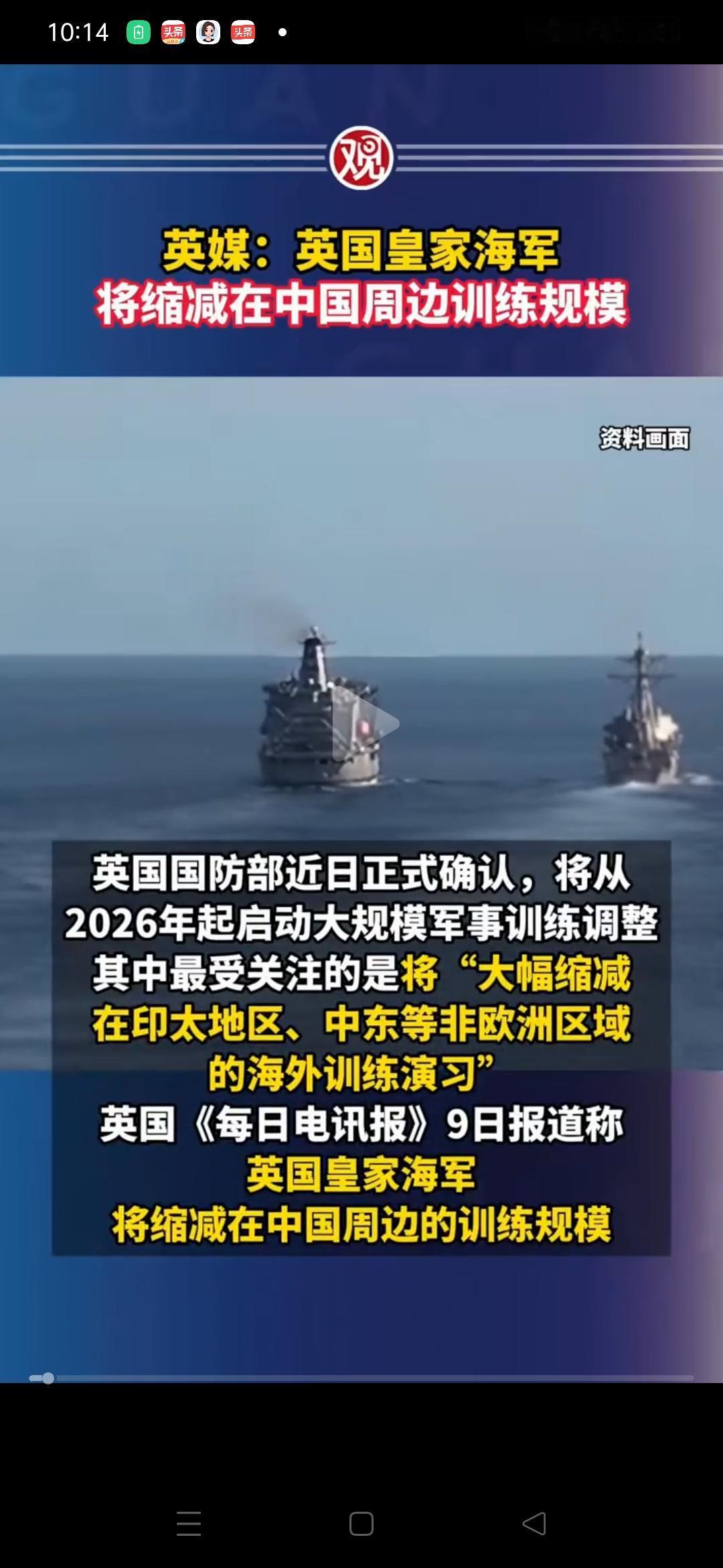 中国周边又安静不小!英国真是美国的小跟班,海军将缩减在中国周边的训练规模! 英国国防部近日正式确认,将从2026年起启动大规模军事训练调整,将“大幅缩减在印太地区、中东等非欧洲区域的海外训练演习”。 美国刚刚调整了《国家安全战略》,将重点放在美洲,中国周边将不再投入更多的力量。英国马上跟着调整军事战略,将欧洲作为重点,中国方向将缩减投入规模。这个世界,最聪明的国家就是英国,搞平衡术最厉害。看到美国老大调整,他紧跟着调整。没办法,没有经济实力,英国顶多算区域大国。 看到英国调整战略,日本会失望,又少了一个帮手;台湾会失望,又少了一个靠山;加拿大、澳洲、新西兰会蔫吧,心里说,美英都不出头,咱们是个啥? 英国海军 英国战略报告 澳媒感叹:西方未来可能赶不上中国