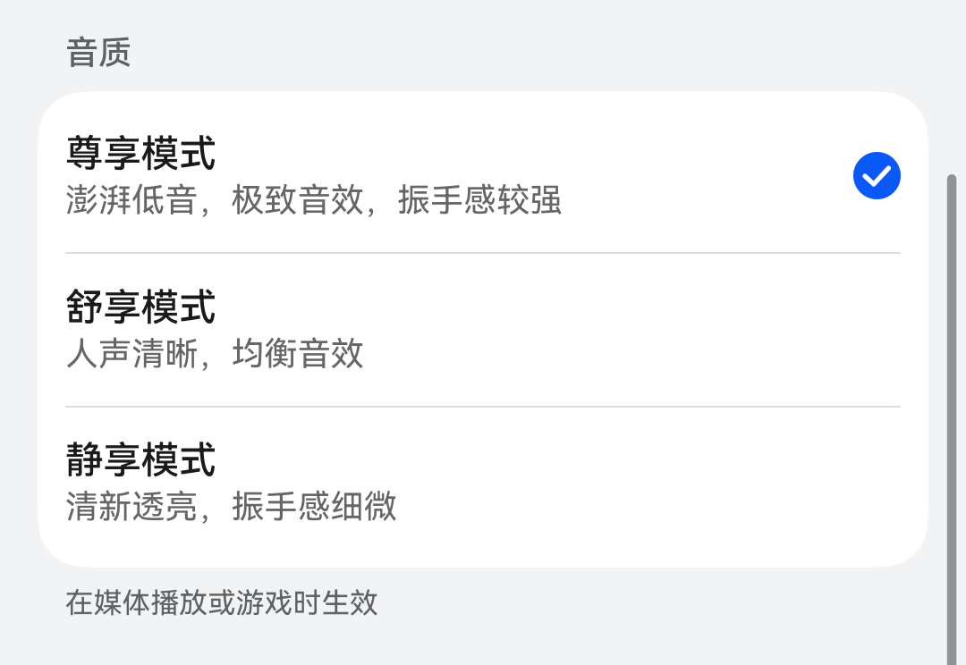 华为Mate X7三个外放音效我都分别试了挺久,最下面那个首先剔除,太差了,默认舒享模式振手感适中但音质依然谈不上多好,是一个适中的选项,尊享模式最振手低音最强,不过听起来还是略糊,比一般的安卓折叠屏强,但还比不了外放不错的对称双扬直板机。