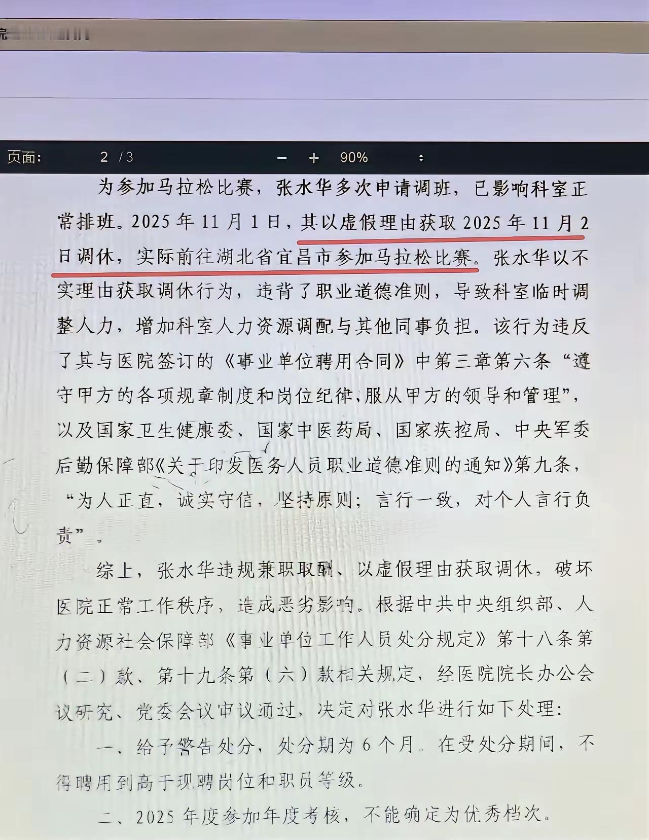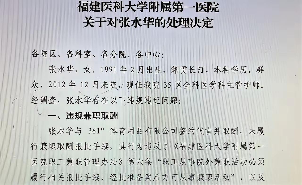 评张水华:跑得再快的护士,也要先当好一名护士 福建医科大学附属第一医院对张水华的处理决定,我完全支持。 张水华号称"跑得最快的护士",那么她的身份首先是护士。 作为一名护士,本职工作是治病救人,而不是在跑道上比赛。 如果不影响工作,自己愿意怎么跑就怎么跑。如果爱好跑步,想专心跑步,那就专职去跑步。 但张水华现在的行为,已经是把跑马拉松放在了护士工作之上。 她知道自己的流量来源离不开护士这一身份,所以她舍不得辞职。 她应该知道,自己跑不动之后,接着干护士,还可以有稳定的收入。 所以,她公然抱怨领导不照顾,以欺骗方式请假参赛,一次又一次让同事牺牲自己的休息时间顶班,她则自己参赛,名利双收。 一句话来说,就是工作别人来干,利益自己来得。 网上还说他们夫妇还发起了医护公益跑项目,真是呵呵了,张水华对自己的同事都不讲"公益"的! 福建最快女护士