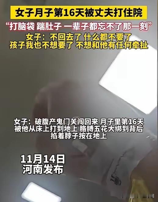 河南一女子剖腹产后才16天,刀口还没完全愈合,就被丈夫挥拳打脸、猛踹肚子,她的婆婆全程抱着孩子在一旁观看。 女子说坚决不回婆家,什么都不要,连孩子也不要,坚决离婚。我支持这个女士的做法,她是清醒的。 女人拿命闯鬼门关生孩子,是为了组建完整的家,不是来受这种畜生不如的对待。就因为几句家常拌嘴,男人就能对刚经历剖腹产的妻子下死手,那一脚踹在刀口上,把夫妻情分、为人底线都踹碎了。 更让人齿冷的是婆婆的沉默,据这个女士的说法,婆婆全程抱着孩子看戏,这份冷漠比拳头还伤人。月子里的女人本就脆弱,更需要家庭的呵护,这个时候遭受家暴,绝望可想而知。 有人说她“不要孩子狠心”,可没被踹在伤口上的人,哪懂什么叫绝望?幸好她没忍,叫救护车、报警、留伤情证据,冷静得让人心疼,也清醒得让人敬佩。 婚姻绝不是暴力的挡箭牌,月子期间家暴必须从重处罚,这种男人就该付出代价。 女人的尊严从不是忍出来的,是站起来挣来的。为她的决绝点赞,也希望所有受家暴的女人都能醒悟。