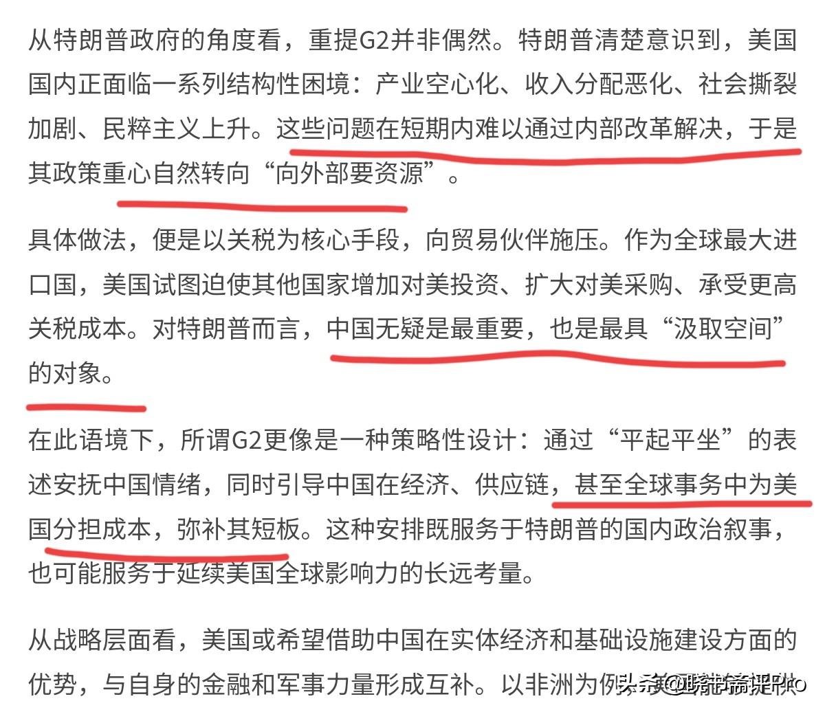 还是联合早报看的透彻!联合早报刊文表示,特朗普的G2提法并非偶然,美国的真实意图是希望中国承担更多的责任。12月11日,联合早报刊文表示,特朗普清楚意识到,美国国内正面临一系列结构性困境:产业空心化、收入分配恶化、社会撕裂加剧、民粹主义上升。而解决这些问题,无非两个办法。其一,内部改革。其二,外部要资源。 而在内部改革短期内难以奏效的情况下,外部要资源这成为了美国最重要的政策,而关税战就是美国外部要资源的明证,而中国是美国首当其冲要资源的第一对象。联合早报认为,美国最起码需要中国在两方面配合美国。其一是,引导中国在经济、供应链,甚至全球事务中为美国分担成本,弥补美国的短板。 其二是,美国或希望借助中国在实体经济和基础设施建设方面的优势,与自身的金融和军事力量形成互补,继续维护美国的影响力。因此,特朗普提及G2,一方面是为了安抚我们的情绪,另一方面其实是要中国干更多的是,分担,乃至帮助美国。对于联合早报的这一观点,我们怎么看呢?无疑,这样的观点非常的正确。说的直白一点,随着美国国力相对下降,美国面临着内外的挑战。 内部而言,美国想要通过再工业化,提供就业机会,扩大美国在全球供应链中的影响力。外部而言,美国摊子铺的太大,力有不逮。当然,美国的构想很好,但是从我们的角度而言,有没有G2我们无所谓,我们更加看重的就是中美关系是不是建立在相互尊重,互利共赢的基础上。中美需要进行合作,但这种合作显然不是靠强制达成的。我们坚决反制美国的贸易战,就是这方面的明证。 而在国际事务方面,中美当然可以合作,我们事实上也并不拒绝与美国的合作,但这种合作应在我们的能力范围之内,我们也不能承担超过我们能力范围的责任。当然,中美完全可以做到相互支持,相互成就,让各自的发展都成为彼此的机遇。关键就在于美国追求独赢,还是双赢,而美国的对华定位,将非常的关键。