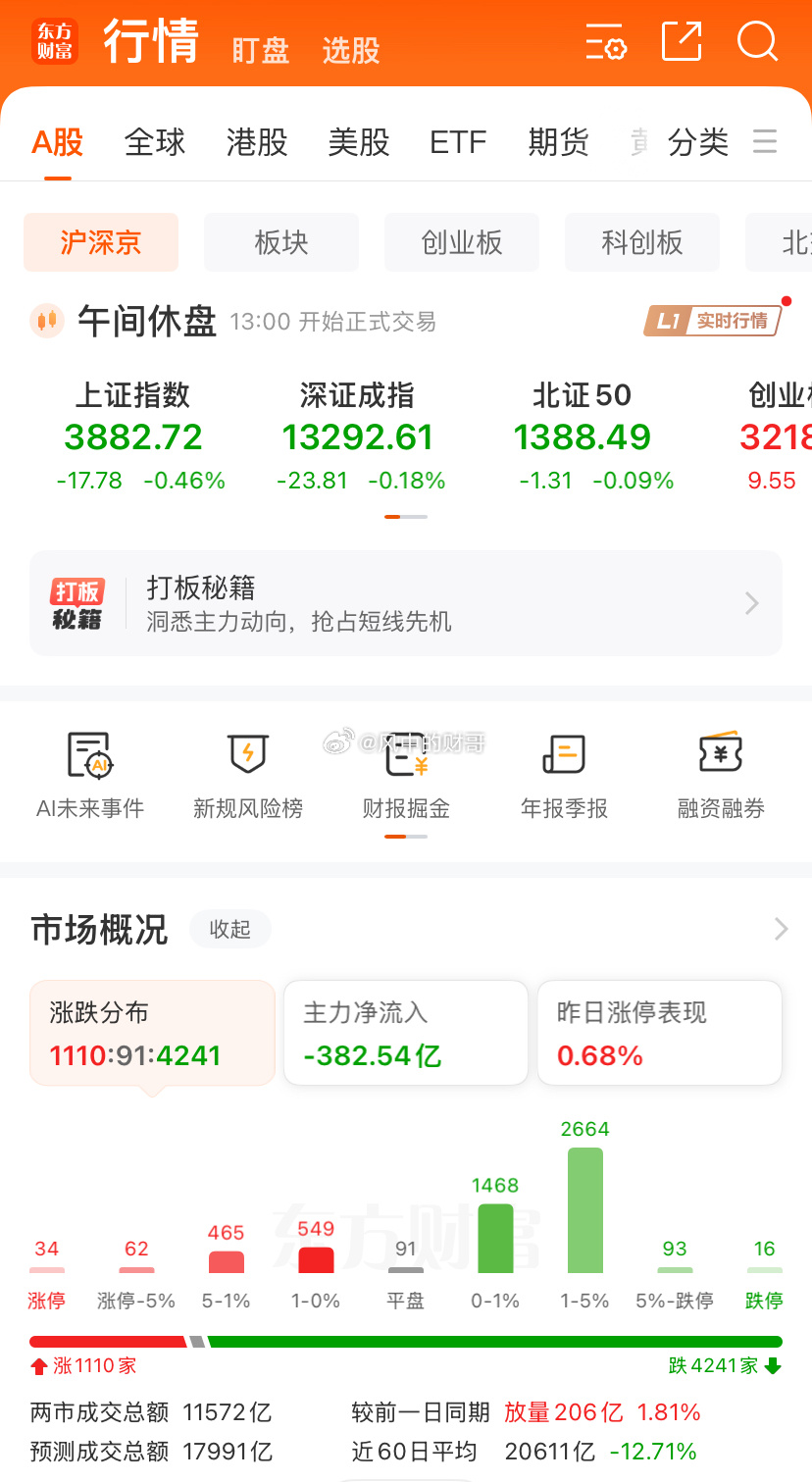 早盘三大指数涨跌不一,沪指弱势震荡,创业板指涨超1%。黄白线分化明显,微盘股指数跌超1%。成交量方面,第一个小时两市放量222亿元,预计全天成交1.84万亿。当前下跌个股超3600家。板块方面,市场出现分化,题材弱势轮动。早盘市场热点集中在商业航天等方向,商业航天概念反复活跃,再升科技4连板,四川金顶6天3板。储能概念早盘拉升,不过整体强度一般,通润装备炸板回落。短线情绪回落,龙洲股份冲高回落,博纳影业炸板回落,安记食品触及跌停。财经今日看盘股票