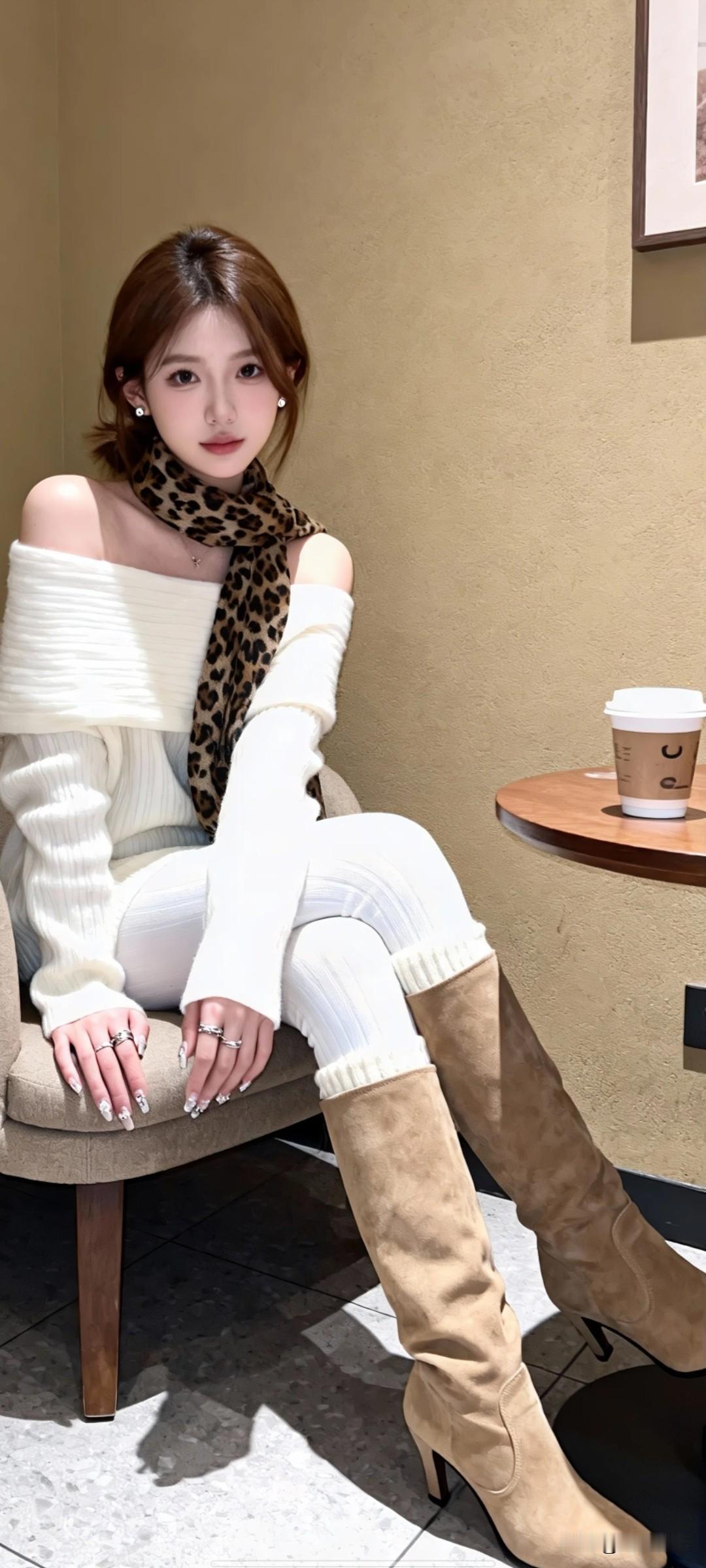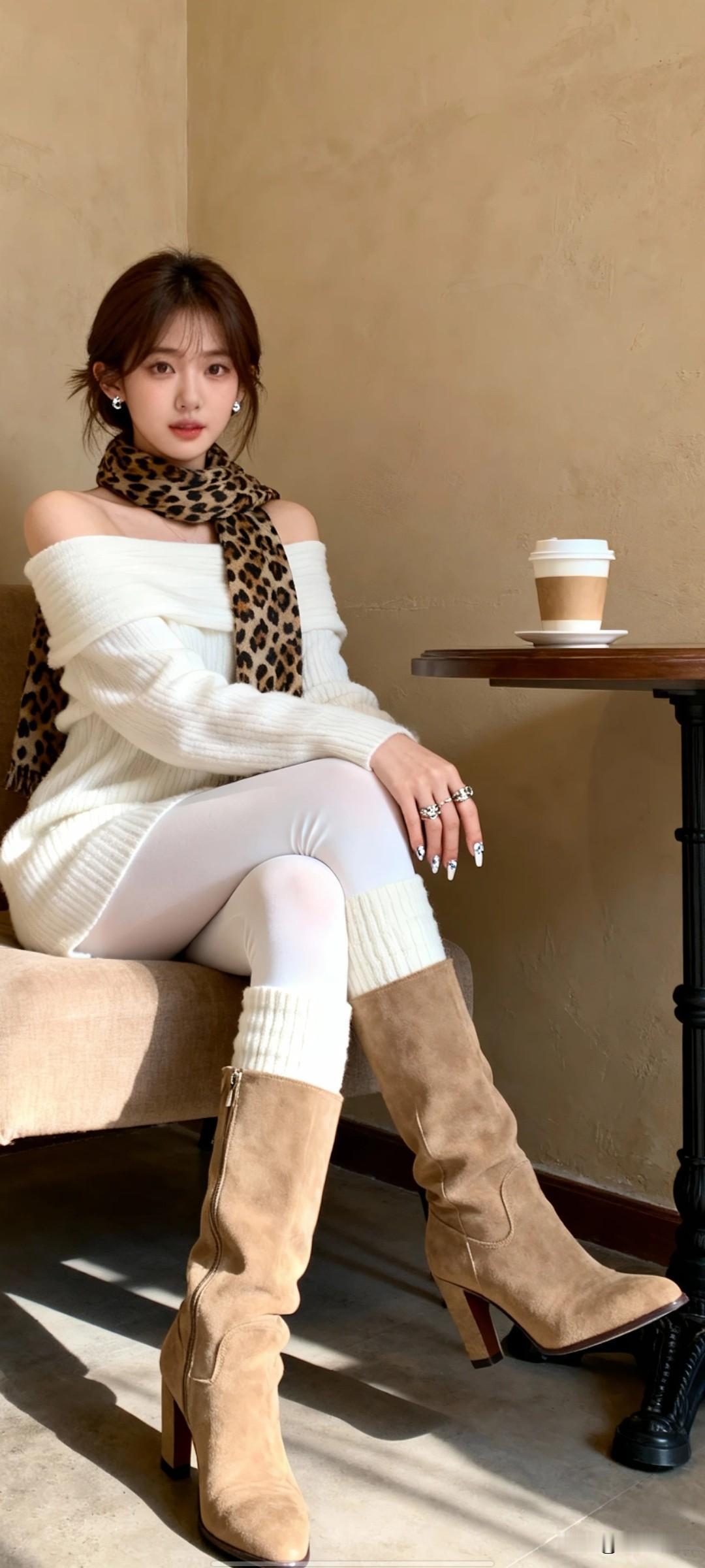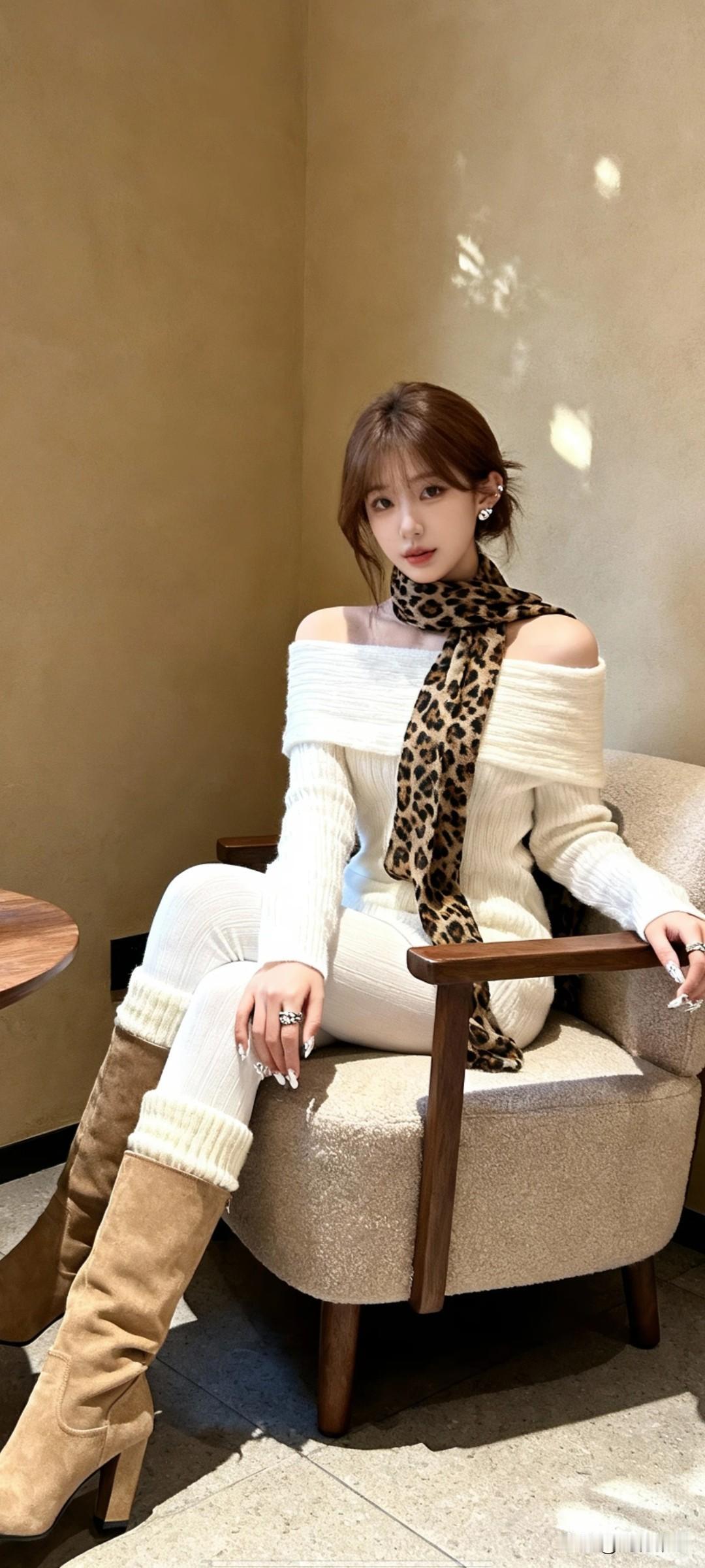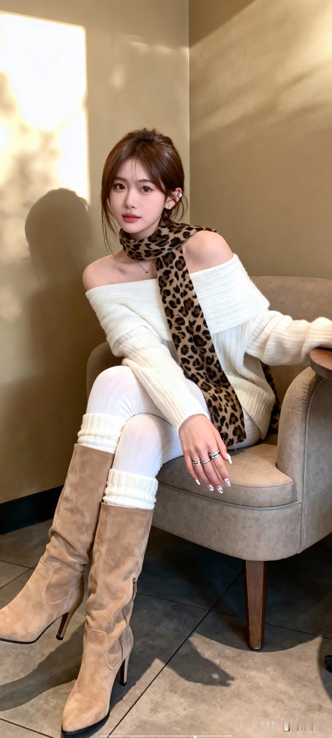 冬日穿搭指南:复古风毛衣+豹纹围巾+高筒靴