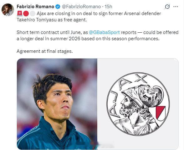罗马诺更新社媒透露:阿贾克斯即将签下前阿森纳后卫富安健洋,他将以自由球员身份加盟。合同为短期合同,至六月到期。据报道,根据本赛季的表现,他可能会在2026年夏季获得一份更长的合同。协议已进入最后阶段 英超联赛 阿森纳著名教授