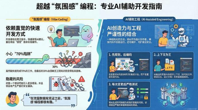 5个让我们真正掌控AI开发的关键思维转变(读beyond.addy.ie后感)氛围编程(Vibe Coding)很厉害,让我们开发速度飞快!然而,这种初期的速度感往往是一种幻觉。当项目进入深水区,那些依赖直觉跳过的细节开始反噬:难以追踪的bug、混乱的架构、潜在的安全漏洞……项目很快就会陷入停滞。这种从快速起飞到寸步难行的困境,正是氛围编程的陷阱所在。如何超越氛围编程的局限,从一个AI工具的使用者,转变为一个能够真正驾驭AI、构建生产级应用的工程师,记住这5个关键。1. 警惕“70%陷阱”:快速原型之后是真正的挑战氛围编程能让我们迅速完成大约70%的工作,一个看起来功能完备的应用很快就能呈现在眼前。但这正是“70%陷阱”的开始。剩下的30%会变得异常艰难,并暴露出几个典型的困境:- 退二进一模式(修复一个bug却引入了更多新bug);- 隐性成本(需要深厚的工程经验才能确保代码的可维护性);- 收益递减(AI工具对资深开发者的帮助远大于初学者)。这部分工作需要的是真正的工程深度,而不仅仅是漂亮的提示词。正如指南中一句极具冲击力的警告所言,我们必须对此保持警惕:“Vibe coding is fun until you start leaking database credentials”需要明确的是,氛围编程本身并非低质量的代名词。它只是AI辅助开发光谱中的一端,非常适用于快速创建原型和验证想法。但对于需要长期维护、要求稳定和安全的生产级系统,我们必须超越它,采用更严谨的工程方法。2. 黄金法则:先规划,后编码与AI协作的最高效方式,不是直接命令它写代码,而是先让它给出一个计划。这是从被动接受到主动掌控的关键一步。直接索要代码,我们将失去对架构和技术选型的控制权;而要求计划,则意味着我们始终是项目的掌舵人。比如:- 糟糕的提示:“给我做一个待办事项应用” - 最佳实践:“给我提供几个待办事项应用的架构选项,从最简单的开始。先不要写代码——只概述方法,然后问我选择哪个方向。” 或直接提供一个迷你产品需求文档 (mini-PRD)为什么“规划先行”如此重要?因为它迫使AI首先呈现其思考过程和架构选择。我们需要记住一个关键数据:十有八九,AI会默认推荐一个过于复杂的方案,我们需要主动要求它进行简化。通过审查计划,我们可以指导它简化设计,确保技术栈符合我们的团队标准,并从一开始就保证项目走在正确的轨道上。这能帮我们避免在错误的方向上浪费大量时间,最终推倒重来。3. 思维升级:从“提示词”到“上下文工程”如果还停留在琢磨如何写出“完美提示词”的阶段,那么是时候进行一次范式转变了。专业的AI辅助开发,核心在于从传统的“提示词工程”升级到“上下文工程”(Context Engineering)。前者是静态的、依赖反复试错的;而后者则是动态的、系统化的,旨在为AI构建一个完整、精准的“信息环境”。可以把AI模型想象成CPU,它的上下文窗口就是RAM内存。我们的任务就像一个操作系统,在处理每个任务时,精准地将必要的数据加载到这块内存中。加载的上下文越是相关和精确,CPU(AI模型)处理任务的效果就越好。具体应该向AI的“RAM”中加载哪些信息呢?- 相关的代码文件和片段- 设计文档和数据库模式 (schemas)- 完整的错误信息和日志- 期望的输出示例通过系统地管理上下文,而不是零散地提问,我们将获得质量和稳定性都远超以往的输出结果。4. 把AI当作“初级开发者”同事一个非常实用的心态是:将AI生成的代码,视为一位充满热情但经验尚浅的初级开发者的产出。它能快速完成任务,但它的代码绝对需要我们这些资深开发者来把关。这意味着,最终的责任在我们身上。作为项目的负责人,我们的核心职责包括:- 严格审查代码: 主动检查代码中是否存在安全漏洞、性能瓶颈和潜在的逻辑错误。不要盲目相信AI会自动遵循最佳实践。- 无情地测试: 在AI完成每一次修改后,都必须运行测试。正如指南中一个关键警告所言:“Critical: No matter what you do, you'll hit situations where AI breaks your app.” 小步迭代、频繁测试是避免灾难的唯一方法。- 确保质量标准: 验证AI生成的代码是否符合团队的编码规范、可维护性要求和整体架构设计。我们是质量的最后一道防线。AI是一个强大的执行者和加速器,但它增强的是我们的能力,而非取代我们的专业判断。最终,构建出高质量软件的,依然是我们的经验和决策。5. 一个被低估的技巧:用“视觉”引导AI在与AI的协作中,我们常常忽略了一个简单但极其有效的沟通方式:视觉。俗话说“一张图片胜过千言万语”,这句话在AI辅助开发中同样适用。为AI提供视觉上下文,往往能一次性解决那些需要反复用文字描述才能说清的问题。这是一种非常强大的技巧,因为它能以最直观的方式传达我们的意图。下次遇到与UI相关的问题时,不妨试试以下几种方法:- 附上产品模型的截图或设计稿- 直接从Figma等设计工具导入设计- 提供包含错误的浏览器实时截图当我们向AI展示一个带有错误信息的界面截图,并要求它修复时,它能立刻理解问题的具体场景,从而给出更精准的解决方案。这种提供“单次解决方案”(one-shot solution)的效率,是纯文本沟通难以比拟的。总之,真正的AI辅助开发,其核心是一场深刻的思维转变。我们正在经历两个关键的演变:- 从关注“实现”(Implementation)到关注“意图”(Intent),- 以及从“编码”(Coding)到“策展”(Curating)。这五个关键点,