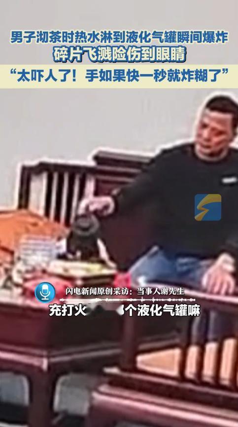 “太吓人了!”12月9日,福建漳州,一男子沏茶时,热水不慎淋到了充打火机的气罐,