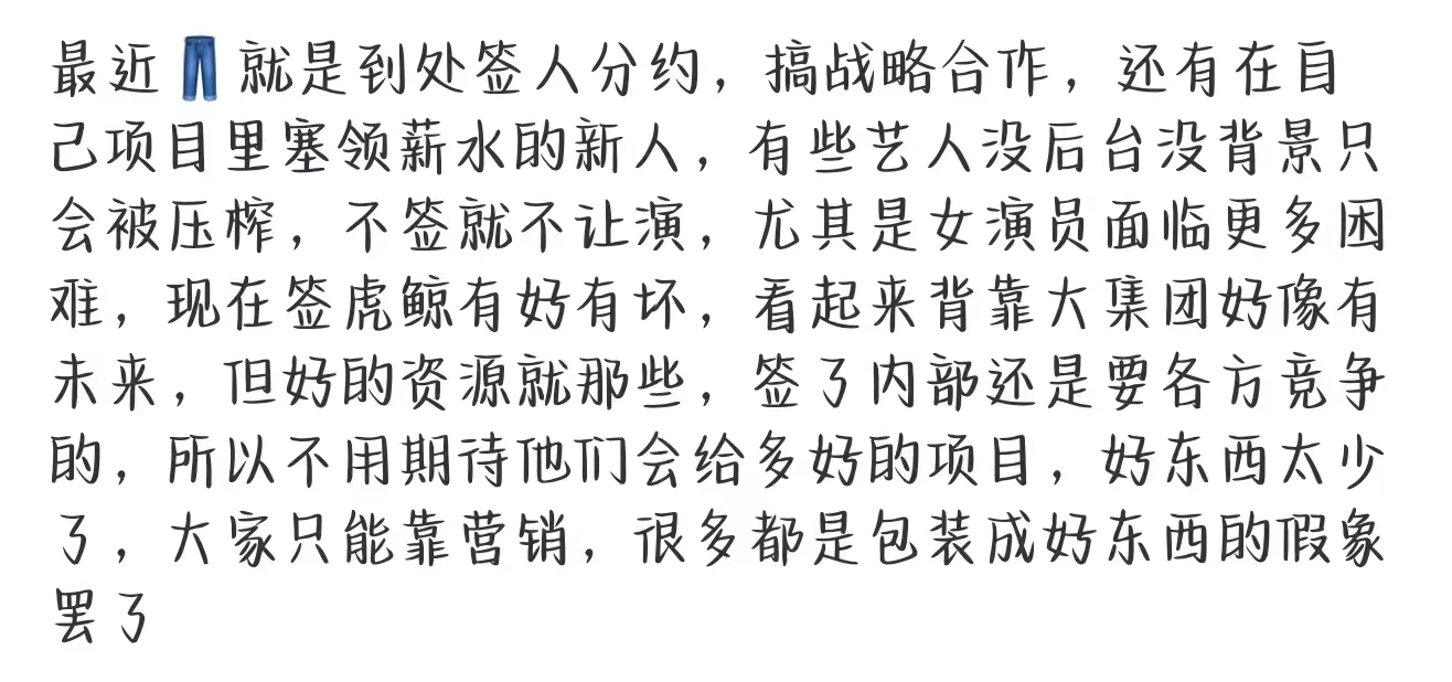 说是最近👖到处搞分约签人,会在自己的项目里塞领薪水的新人,没背景的艺人不签就不让演,真的假的