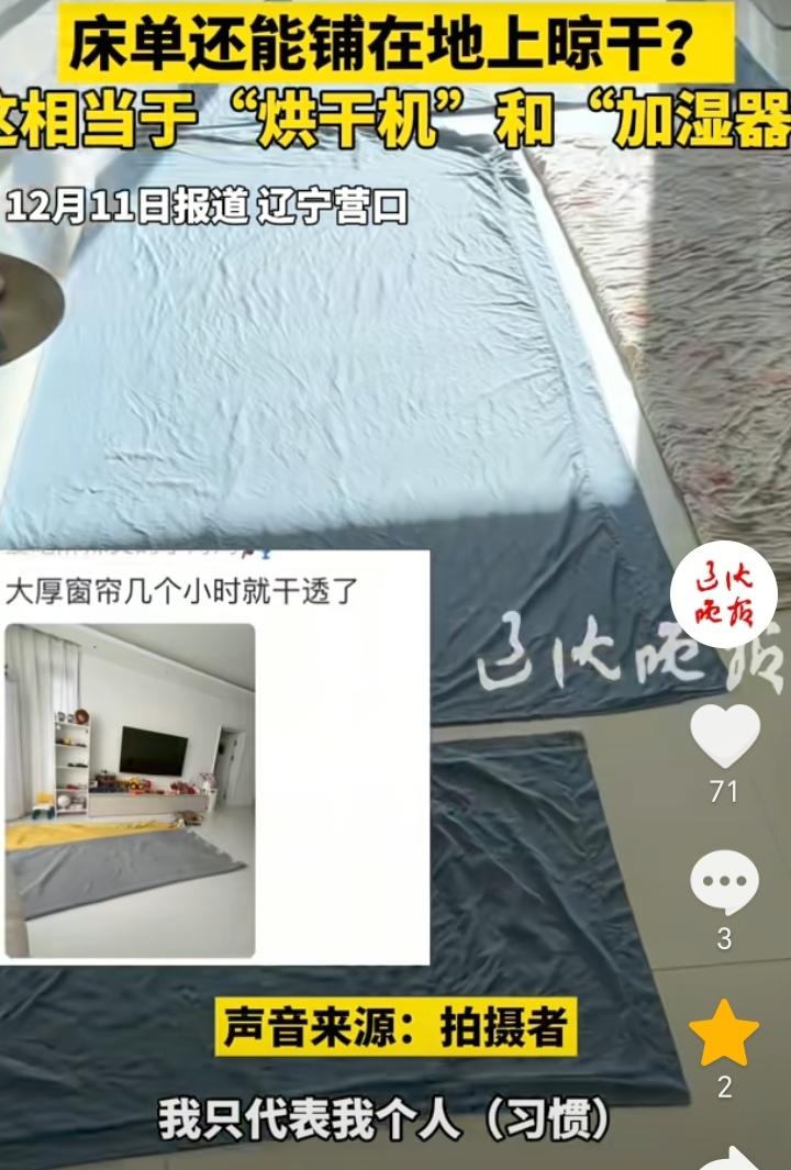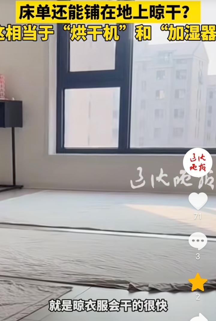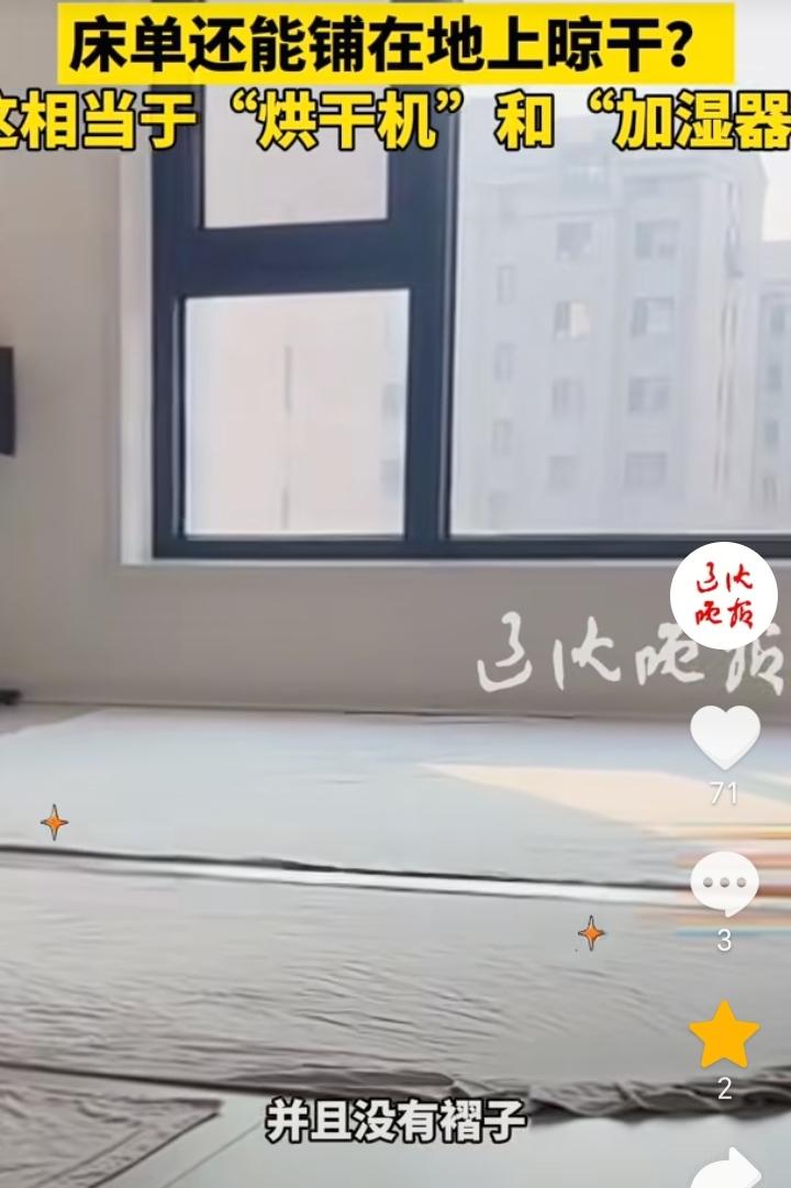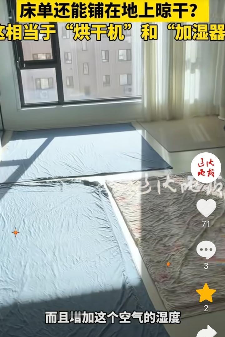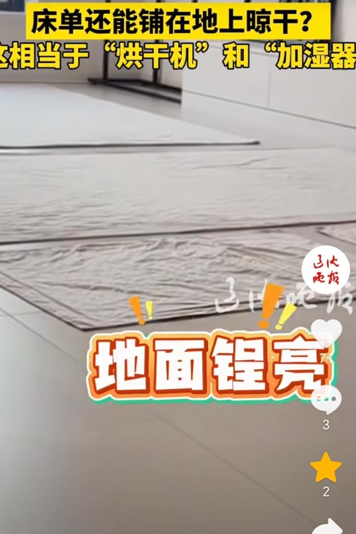 一举多得!辽宁营口,东北女子因为家里有地暖,于是她就把地拖的锃亮,然后把床单铺在地上,不仅凉的很快而且还会增加空气的湿度,晾完后还不起褶子。 地暖还有这样的功效,真是长见识了,不仅把衣服晾了不会起褶子,而且还增加了空气湿度,真是一举多得。 原本冬天晾衣服干的就比较慢,如果用女子这种方式直接在有地暖的地板上晾衣服,那就再也不用担心衣服晾的慢了。 办法总比困难多,只要肯动脑筋,很多事情都会迎刃而解。