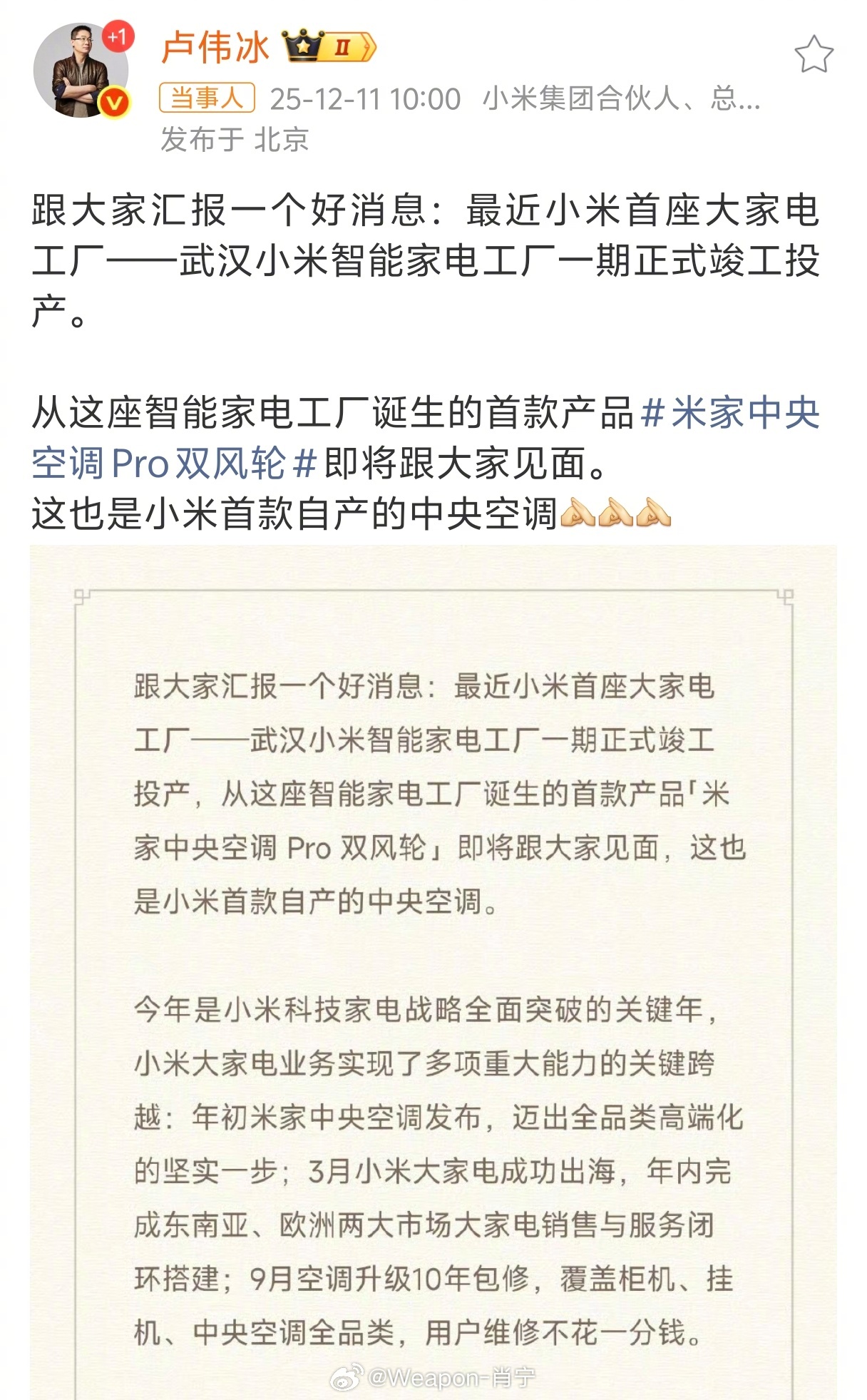 卢伟冰宣布小米将发布自产中央空调 说起小米的大家电业务,还真是这几年家里换电器时绕不开的选项。以前买电视冰箱总盯着传统品牌,现在身边越来越多人会补一句:“要不看看小米的?”一开始总觉得小米做家电是“玩票”,毕竟数码产品公司跨界做空调洗衣机,听着略显靠谱。但真去商场体验过,或者朋友家用了之后,发现做工和细节居然还挺扎实。比如小米空调的安装服务,冰箱的铰链、面板接缝这些细节也不输老牌子。后来才意识到,小米背后其实藏着中国制造业积累多年的“隐形能力”——它自己虽然不直接开工厂,但合作的都是行业里给国际大牌代工十几年的老手。比如做空调的合作方,很可能就是以前给日本品牌代工的技术团队。这种“制造能力外挂”让小米能快速把设计变成靠谱的产品。最让人服气的是品控。以前觉得互联网品牌容易“参数漂亮但用着糟心”,但小米大家电反而在基础功能上很稳。比如洗衣机洁净率、冰箱降温均匀性这些核心指标,网上拆机测评经常发现它用料实在(比如用更厚的保温层、双循环制冷)。这种“不偷工减料”的底气,或许正来自小米对供应链的严格把控——毕竟手机行业淬炼出的品控体系,放在家电领域算“降维打击”。现在小米生态链的联动越来越自然。空调和加湿器能根据温湿度数据自动调节,冰箱屏幕能显示门口摄像头的画面,这种体验传统品牌很难有的感觉。有人说小米是“全家桶营销”,但对普通家庭来说,这种跨品类协同恰恰解决了真实痛点——谁不想下班前用手机预约煮饭、空调提前开启呢?真正让人感慨的是,小米可能是目前全球唯一同时把手机、家电、汽车三大硬件领域“吃透”的品牌。手机是万亿级市场的血海竞争,家电考验制造和渠道深耕,汽车更是工业皇冠上的明珠。小米在三块都坚持自研核心技术+自主生产把控(比如空调压缩机技术、汽车电机电池包),而不是简单贴牌。这种“三条战线同时攻坚”的野心,背后其实是中国制造业从代工走向原创、从单一品类突破到系统整合的缩影。当然也不是没槽点,比如设计语言太统一导致缺少个性,高端型号价格优势不明显。但作为普通消费者,看到一个有手机思维的公司倒逼传统家电行业加速创新,总是乐见的——至少现在买电器时,总会多一个小米选项值得认真比较了。