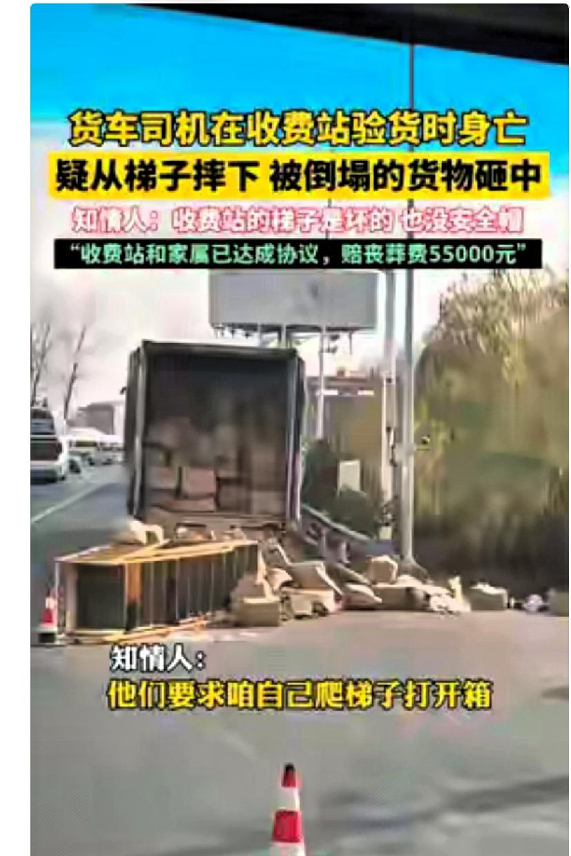 真是什么奇葩事都有! 这件事必须严查到底! 近日,河南商丘一货车司机过收费站时,工作人员要检查车上的货物,要求司机爬梯子上去拍照验货,结果收费站的梯子是坏的,再加上司机没有佩戴安全帽,没人扶梯,最终摔落离世。 这件事到底是谁的责任?这种事不应该是收费站工作人员的任务吗? 网友纷纷表示这件事收费站有重大责任。正常的履行检查是应该的,但你必须按照有关规定,规范检查,如果你的检查不规范,出现问题你是逃不掉责任的。