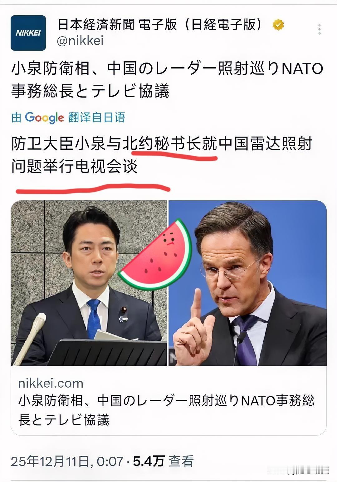 日方找北约“哭鼻子”? 戏精上身太可笑! 日经新闻12月11日爆料,日本防卫大臣小泉进次郎急着跟北约秘书长视频,吐槽所谓“中国雷达照射”,忙着找靠山撑腰,戏码拉满。 中方开启雷达警告,本是国际通行的反制操作,日本却倒打一耙。更可笑的是,录音打脸还嘴硬,跑去北约诉苦蹭热度,贼喊捉贼的样子着实滑稽,谎言根本藏不住挑事的心思! 如今跑去向北约诉苦,无非是想借外部势力给中国施压,顺便推进北约亚太化。但谎言撑不起野心,中方演训合法合规,日本再怎么炒作,也掩盖不了自己挑事的事实! 挑衅在先还倒打一耙,这般操作你怎么看?
