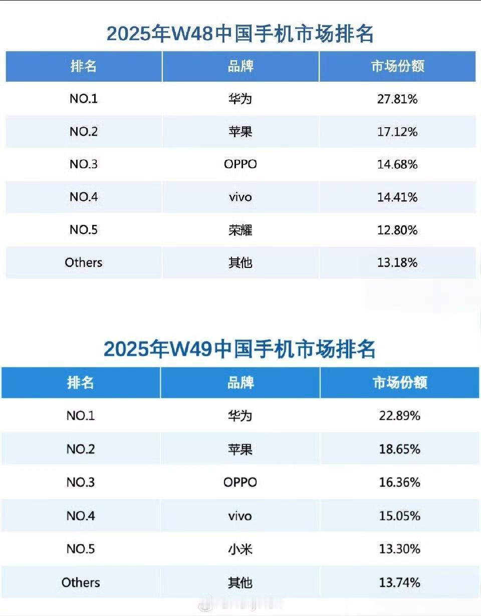 华为连续两周超过苹果,重夺中国手机市场份额第一,W48更是超过苹果10%,剩下的就交给产能了,不少人都在等HUAWEI Mate80 Pro。