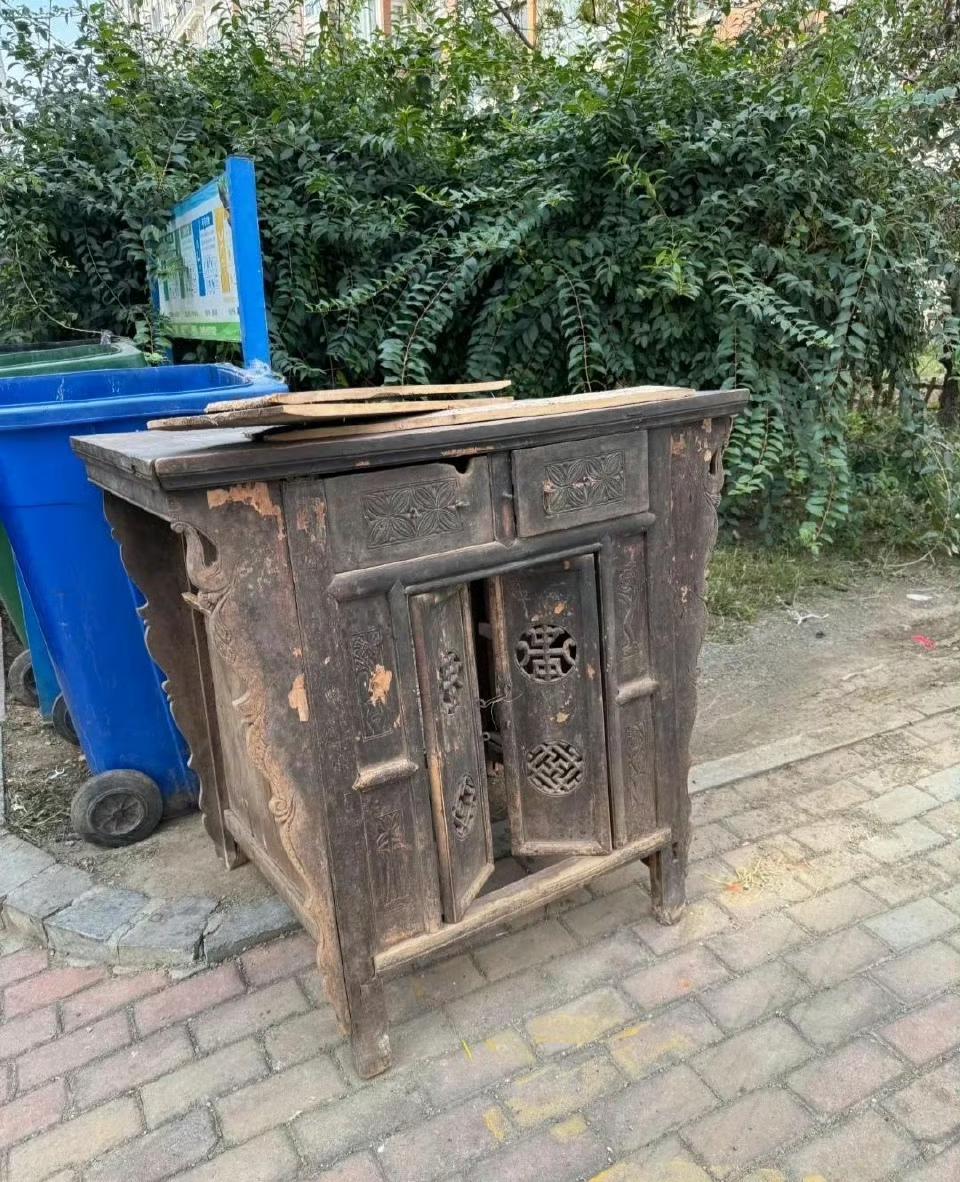 小区垃圾桶边上的桌子,看着有点年头了!捡还是不捡?