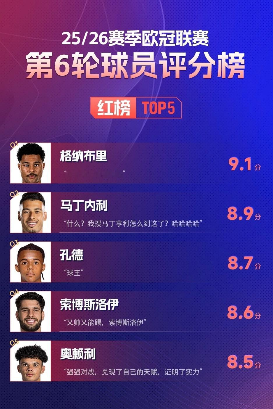 欧冠小组赛收官战今晨燃爆落幕!多场焦点对决高潮迭起,格纳布里、马丁内利等球星火力全开、表现抢眼。球迷们也纷纷化身“评分官”,为心中的最佳与最差球员打出分数、奉上犀利点评。话不多说,新鲜出炉的欧冠红黑榜,速来围观!