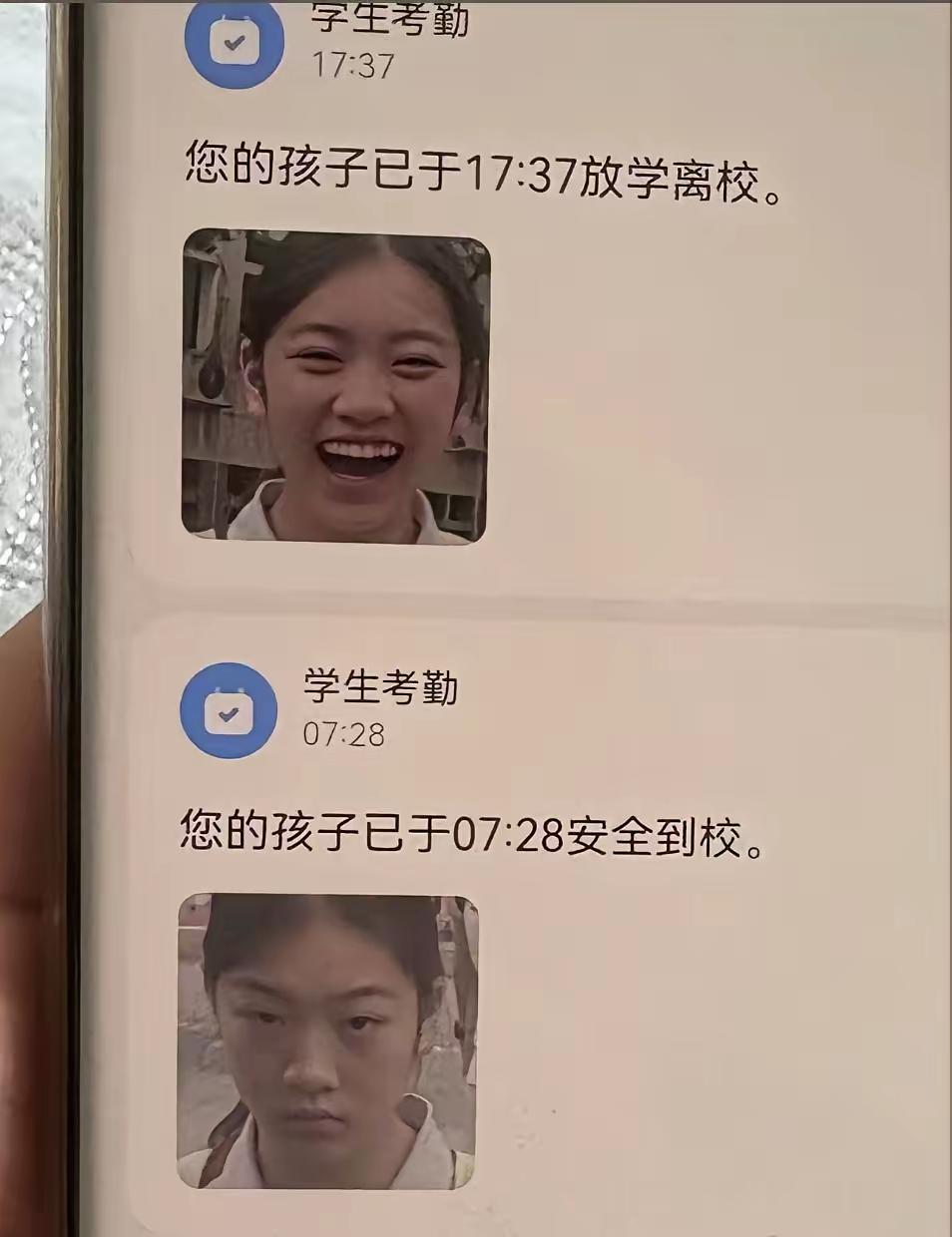 这学校多体贴 还能拍下学生进出学校的时间和模样,并且发送到家长手机。这样就能安心的知道自己孩子状态了。 只不过这个上学放学表情对比挺明显啊,放学时开怀大笑是因为学了一天知识很满足吗?