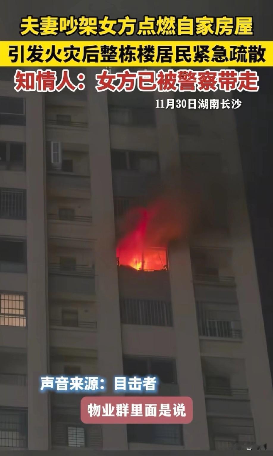 坏人绞尽脑汁不如蠢人灵机一动! 夫妻吵架女方放火烧家! 近日长沙一女子烧家,原因两人在电影院门口因为小事吵架,回家后女的一生气把房子给烧了,结果惊动了大量的消防警力!整栋楼紧急疏散!女方目前已被抓走! 纵火女子表示“自己为这个家付出了那么多,却是今天这个结果,很生气,于是去卧室放火,后面发现救不了了,很后怕,其实就是想气气自己的老公” 这是典型的纵火罪,这是要牢底坐穿啊 这回不用吵了,去监狱生闷气去吧![捂脸]