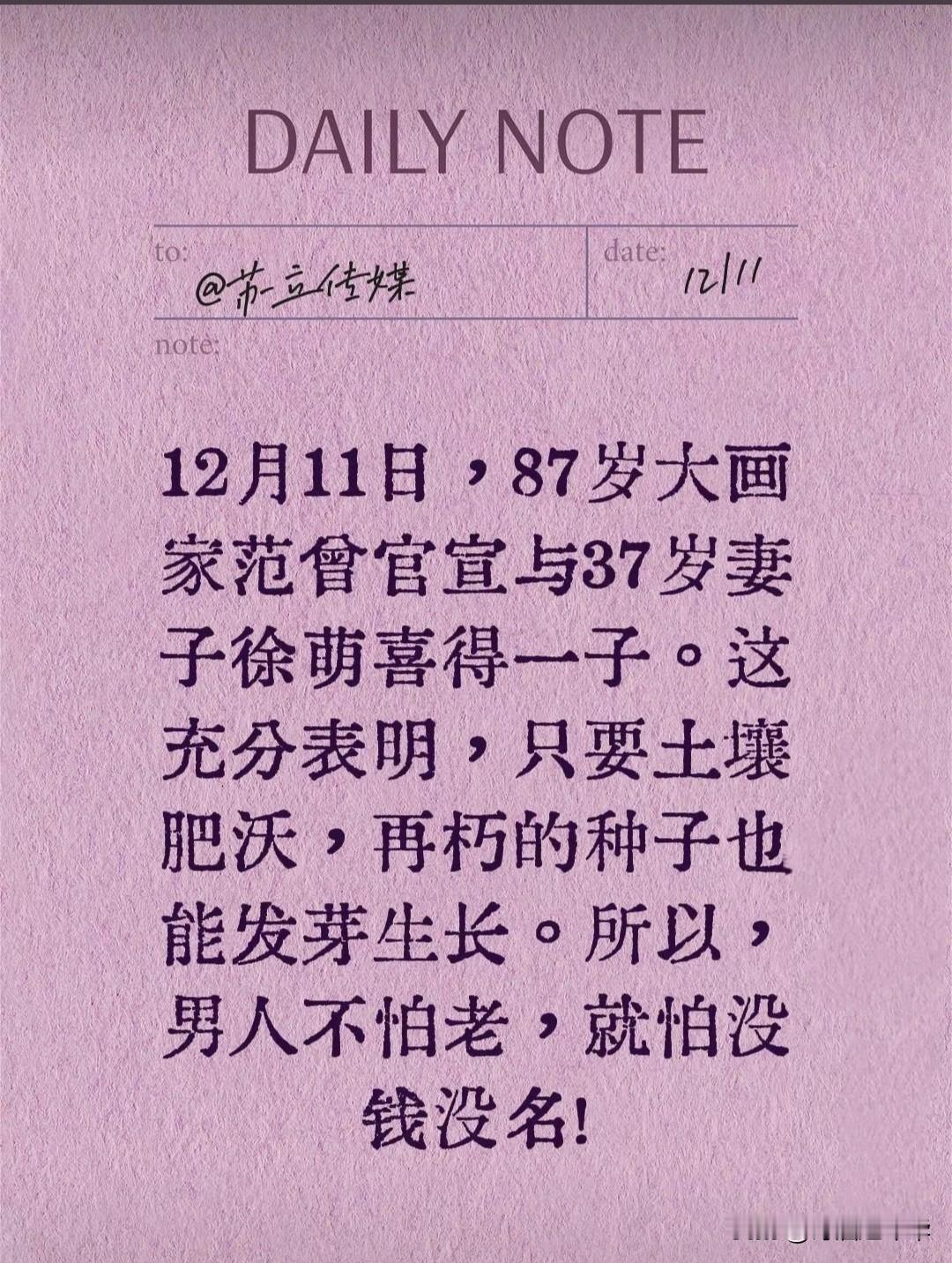 87岁书画家范曾携37岁小娇妻官宣喜得独子,已经到了挂墙上的年龄,还这么有活力,这也证明,只要土地肥沃,再陈年的种子也能发芽。同时,他也宣布与女儿和继子断绝关系,只是不知道这老登有没有做亲子鉴定。