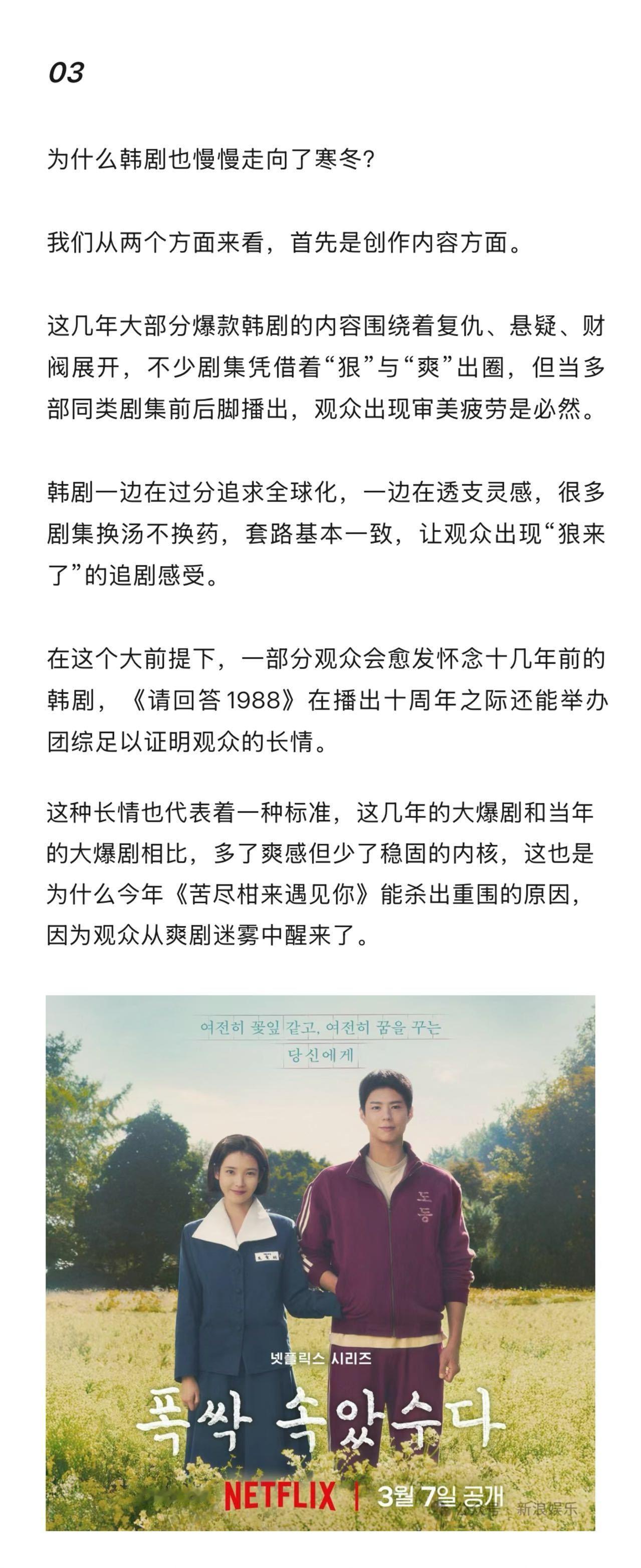 爆款韩剧背后的影视寒冬为什么今年的爆款韩剧变少了 曾几何时,韩剧是亚洲影视圈的“爆款制造机”——2013年《来自星星的你》掀起全球追剧潮,2015年《请回答1988》成为跨世代经典,2021年《鱿鱼游戏1》让韩剧跻身全球流行文化。但迈入2025年,这份辉煌难再延续,除了tvN的《苦尽柑来遇见你》豆瓣9.4分突围,网飞力推的《恶缘》《认罪之罪》均未大爆,万众期待的《鱿鱼游戏3》也未能复制初代红利,全年爆款屈指可数。从三大台垄断到tvN崛起,再到网飞改写规则,韩剧市场为何从“年年有爆款”陷入“寒冬困境”?是悬疑复仇题材扎堆导致的审美疲劳,还是资本收缩下中小成本作品难有出头之日?