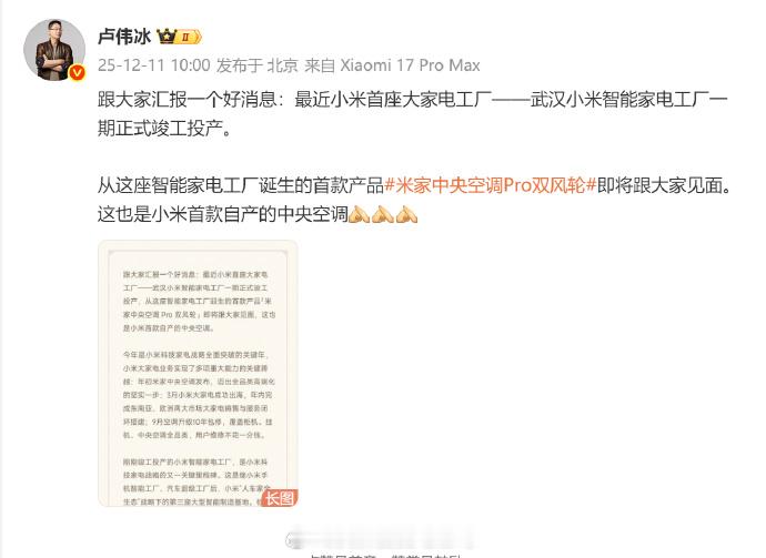卢伟冰宣布小米将发布自产中央空调 恭喜小米,米粉们可以放心买小米自产的空调了。