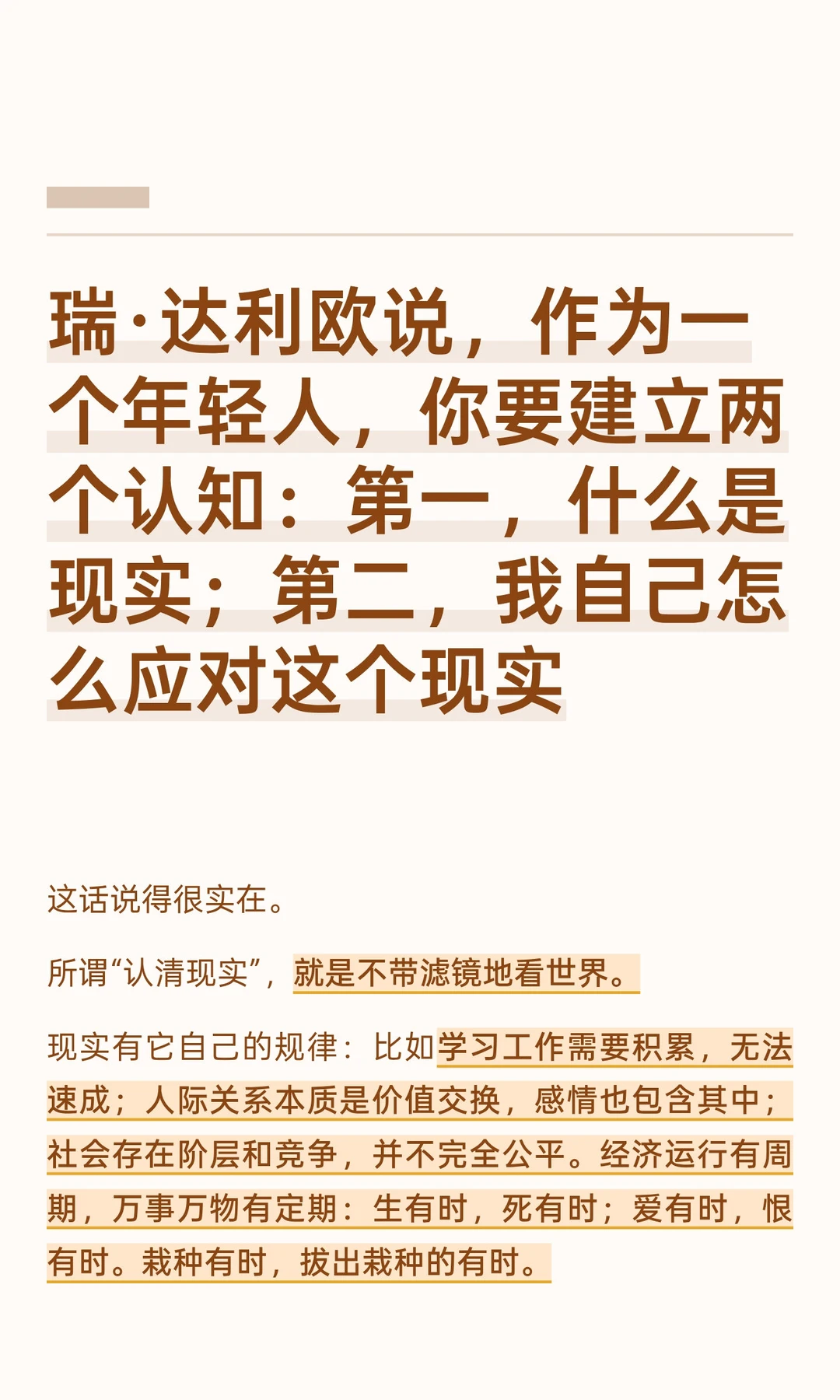 瑞·达利欧说,作为一个年轻人,你要建立两个认知:第一,什么是现实;第二,我自己怎么应对这个现实。