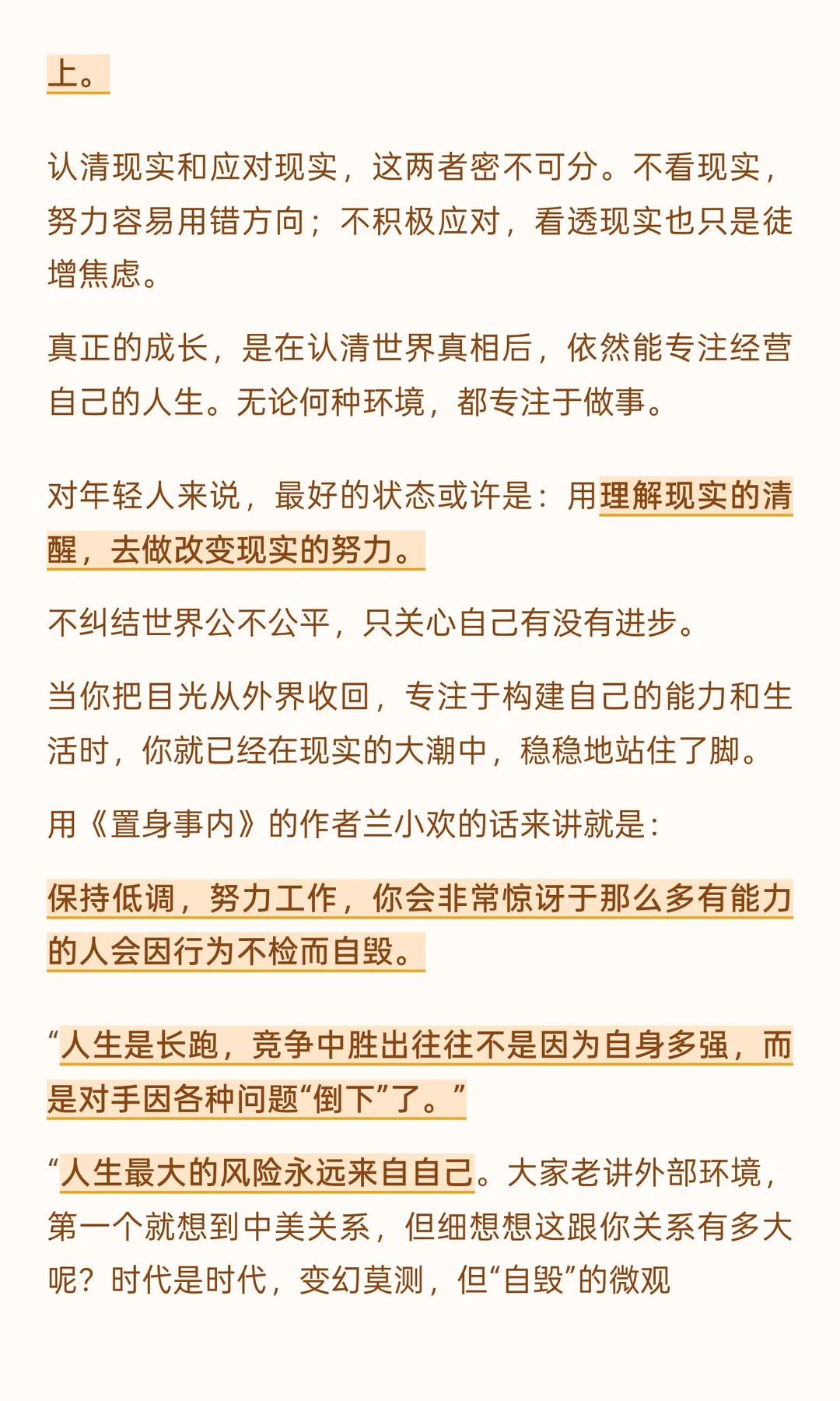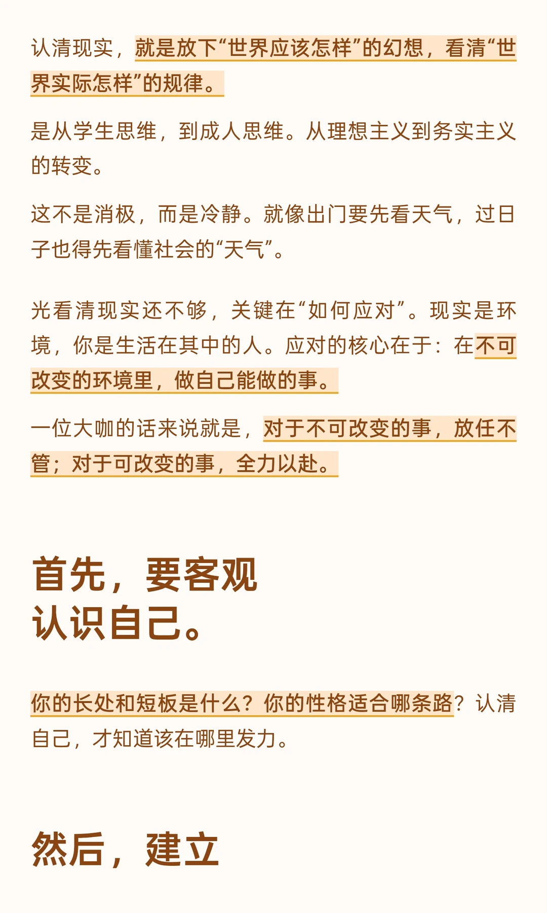 光看清现实还不够,关键在“如何应对”。现实是环境,你是生活在其中的人。应对的核心在于:在不可改变的环境里,做自己能做的事。