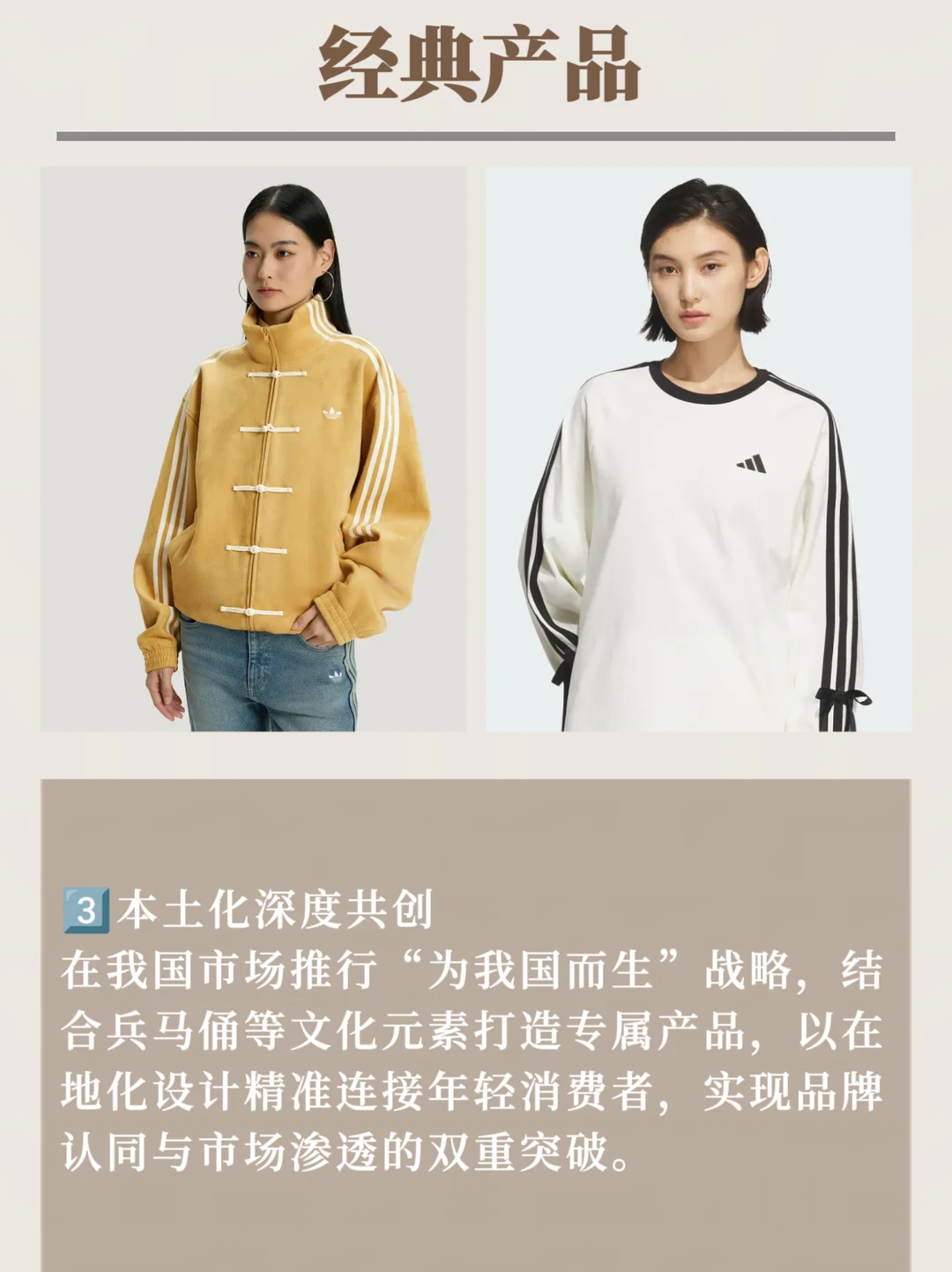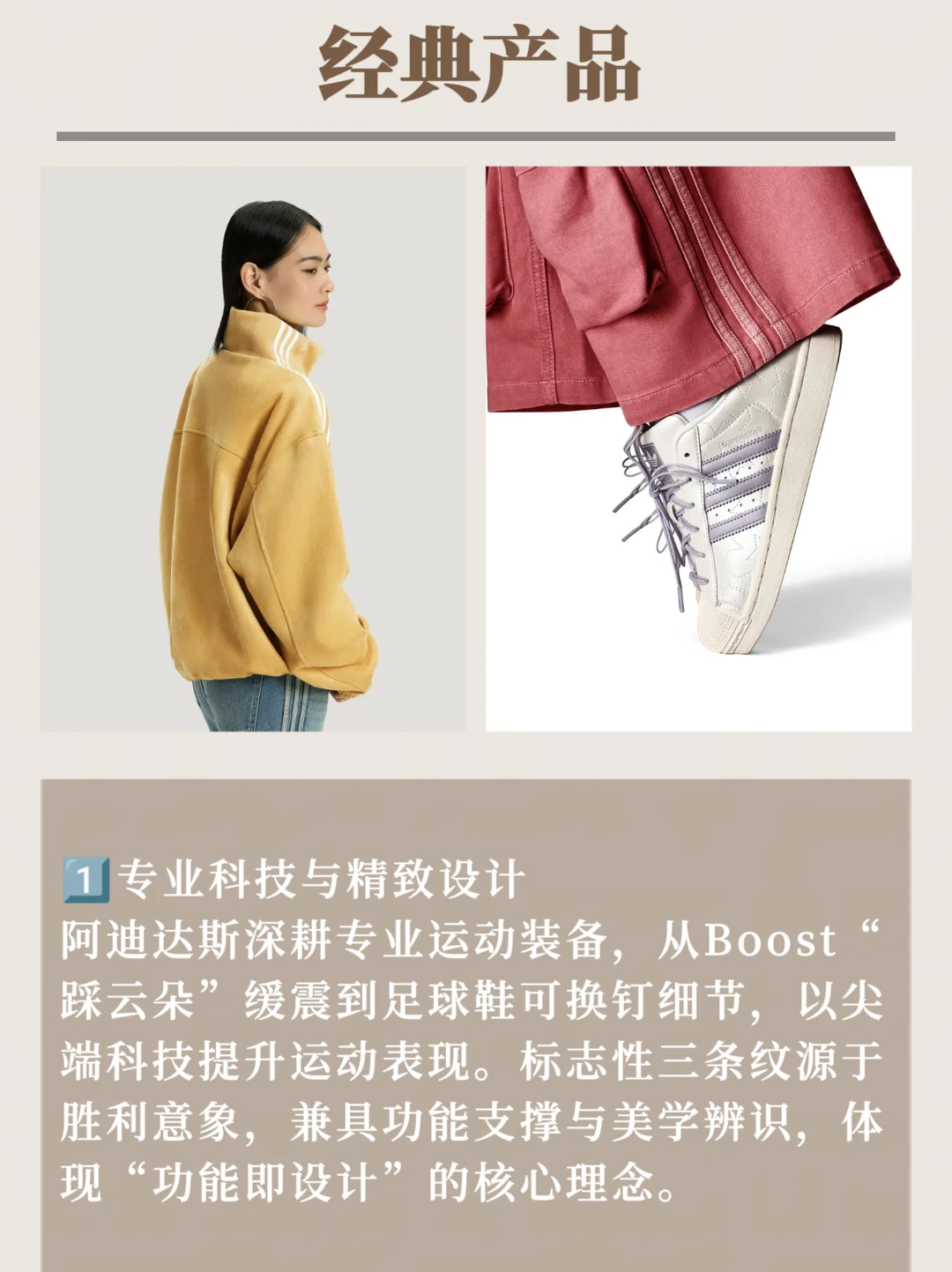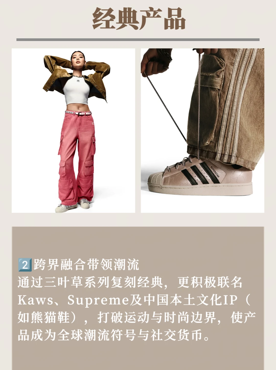 通过三叶草系列复刻经典,更积极联名Kaws、Supreme及中国本土文化IP(如熊猫鞋),打破运动与时尚边界,使产品成为全球潮流符号与社交货币。