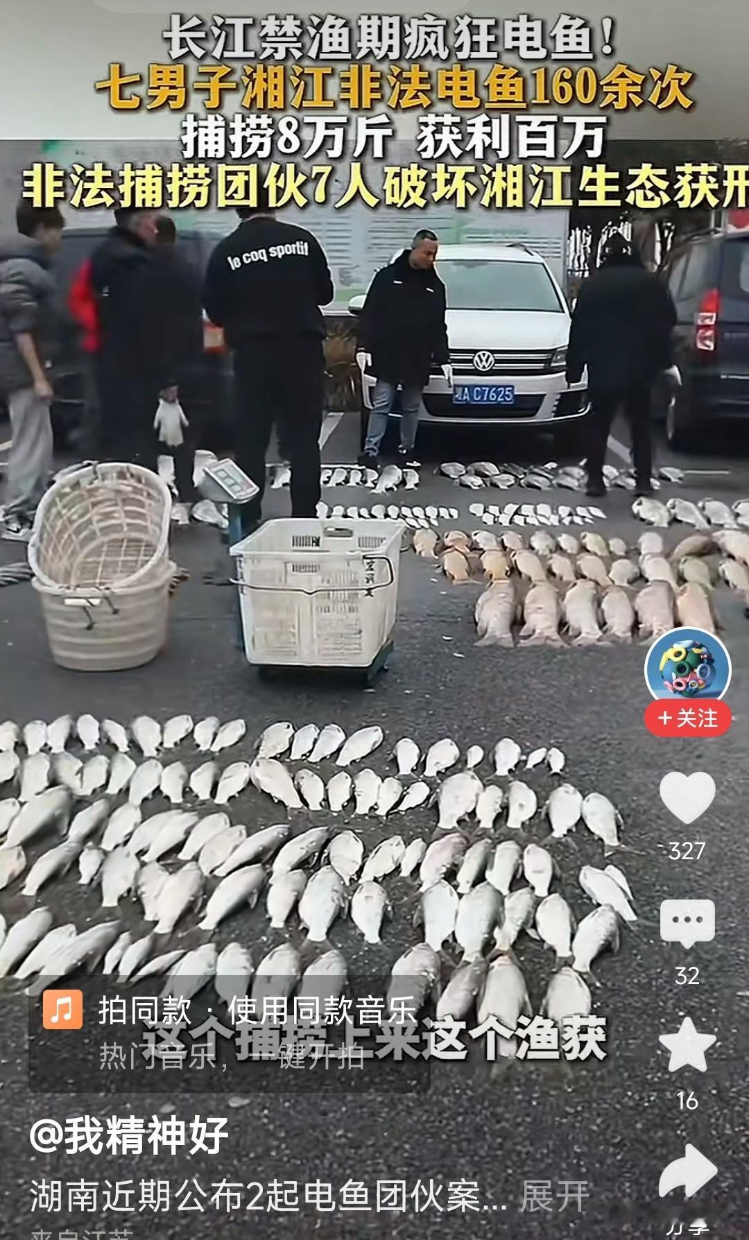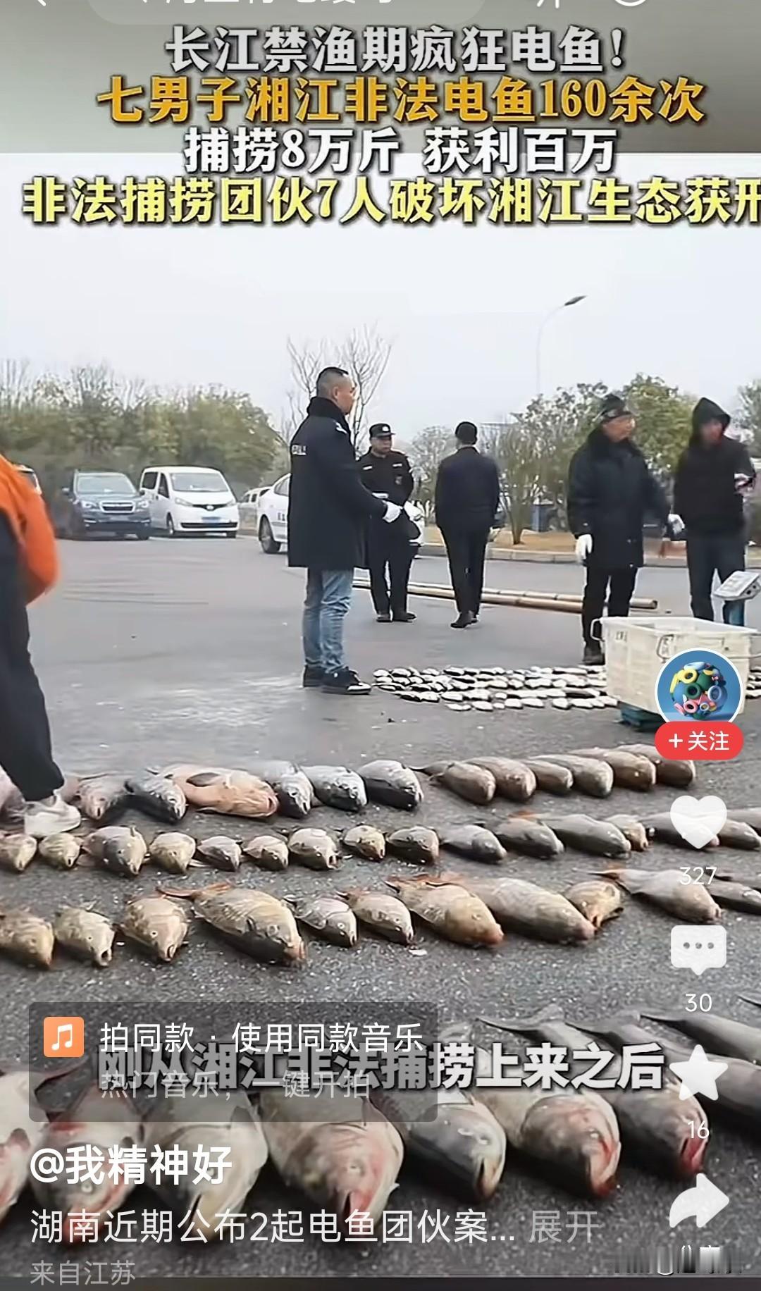 非法电鱼胆子太大了,长江禁渔期还敢去电鱼,这人难道是不是有毛病了,七个男子去湘江电鱼,这是严重违法,电鱼破坏水中生态,把水中的大小鱼,甚至泥鳅鱼,黄鳝,淡水螺都能电死。电鱼所到之处大小鱼都完蛋了,有的飘起来,有的沉底了,臭了对水质都有影响。 在长江禁渔期电鱼是要被重判的,好在湖南渔政及时出手,抓到了人赃俱获,收网及时,抓到七个男子在湘江电鱼,捕捞8万斤,获利一百多万,这下玩了,捕捞的太多了,牢底坐穿了。 平时没事去钓鱼还可以,敢电鱼,这是严重违法,在任何时候都不可以电鱼,电鱼也危险,容易把自己电着,有多少电鱼漏电把自己电死的,干什么不好非要电鱼呢?这也太危险了。