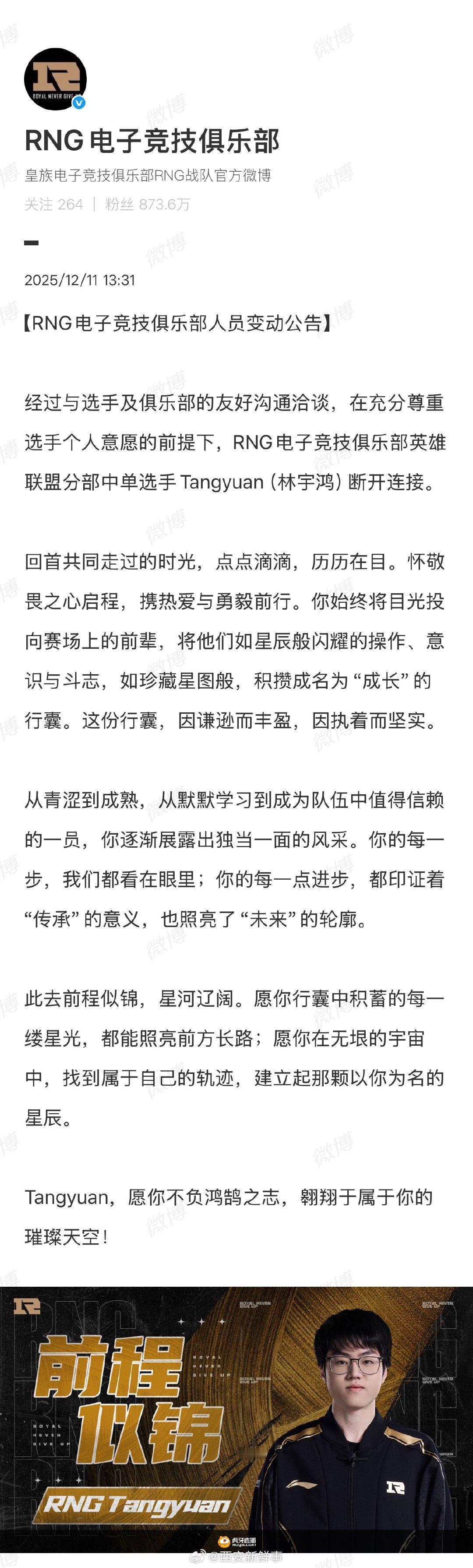 RNG官宣与Tangyuan解约RNG官宣和Tangyuan解约12月11日,官宣与Tangyuan解约:经过与选手及俱乐部的友好沟通洽谈,在充分尊重选手个人意愿的前提下,RNG电子竞技俱乐部英雄联盟分部中单选手Tangyuan(林宇鸿)断开连接。