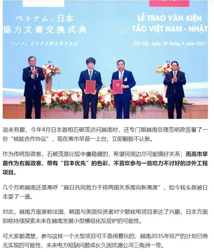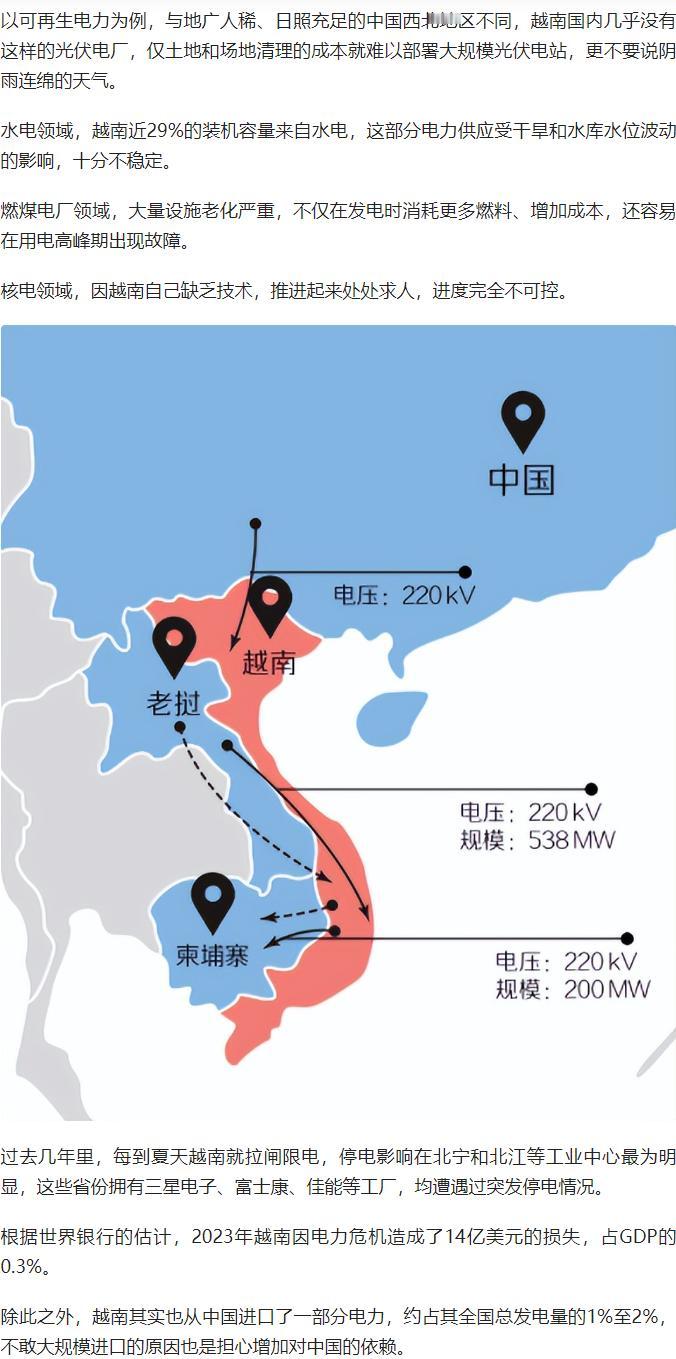 日本以 “工期紧” 为由突然退出越南宁顺二号核电项目,实则是报复越南禁摩令重创本田利益? 这对电力告急的越南堪称致命打击!其电力需求年增 8-9%,2023 年停电已致 14 亿美元损失,湄公河三角洲聚集的三星、苹果等企业岌岌可危。 光伏受限于土地与天气,水电依赖气候不稳定,火电老化且碳排放受限,核电又因缺技术处处求人。 本想分散风险的 “竹子外交” 遇挫,越南虽能从中国购电却不敢依赖,2035 年投产目标彻底泡汤,电力危机或将长期拖垮其制造业! 原文来自:江宁知府《缺电的越南,关键核电项目被日本“放鸽子”》