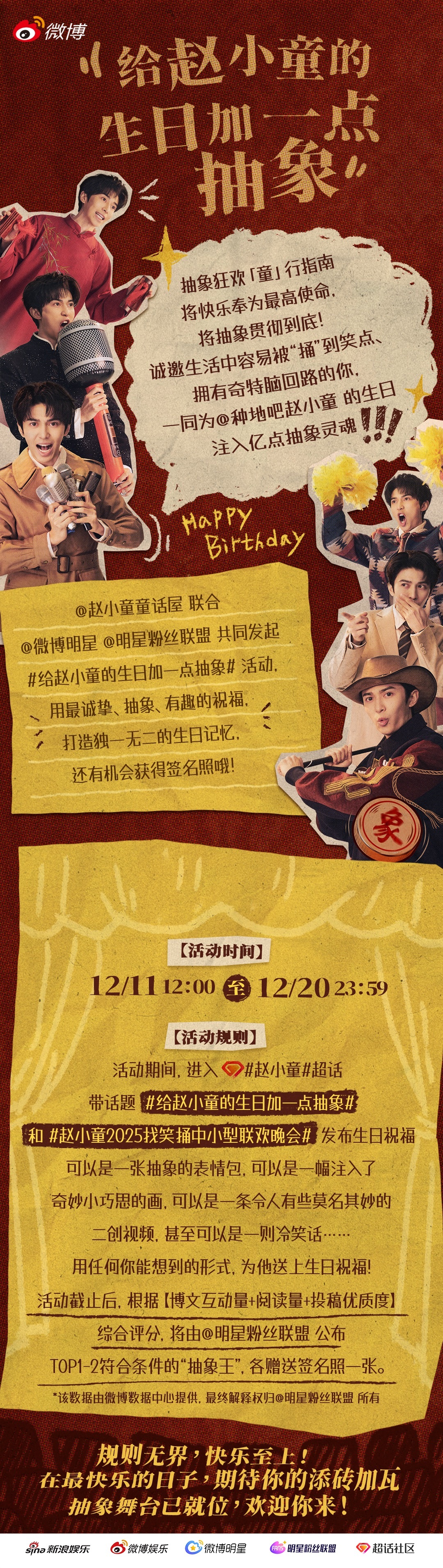 赵小童2025找笑捅中小型联欢晚会 联合 共同发起 给赵小童的生日加一点抽象 活动,邀你来参与!活动期间,进入赵小童 ,带话题 给赵小童的生日加一点抽象 和 赵小童2025找笑捅中小型联欢晚会 发布生日祝福,有机会获得签名照奖励哦!抽象舞台已就位,欢迎你来!