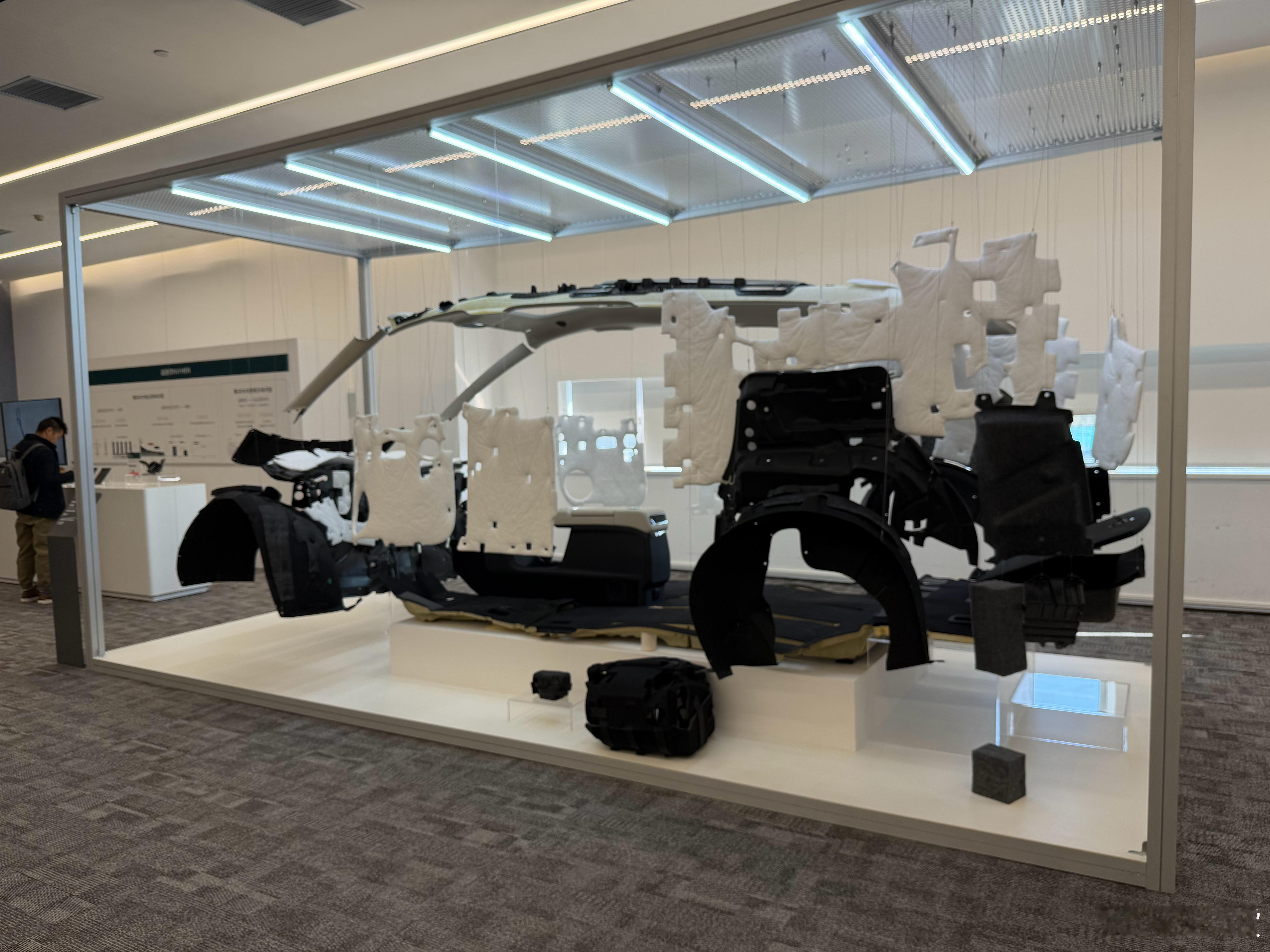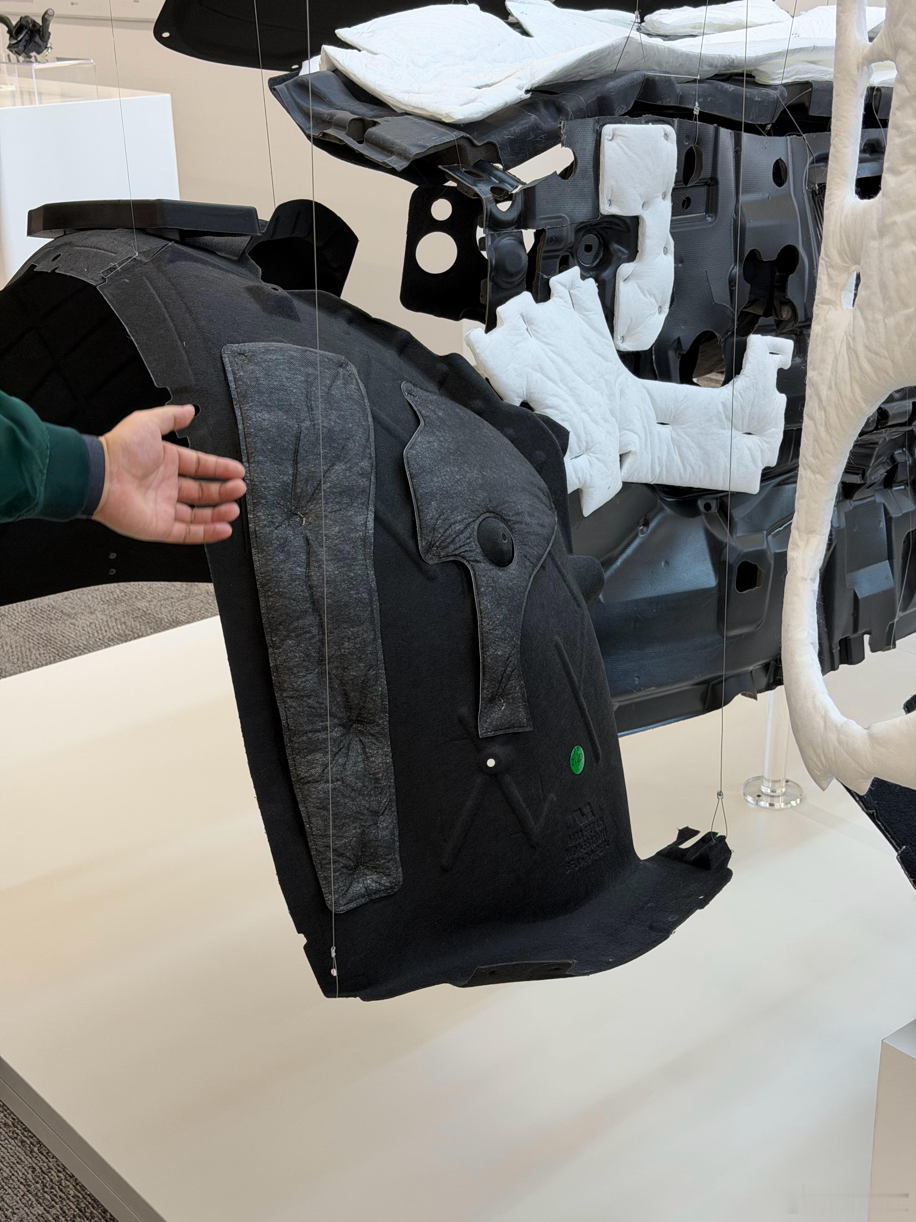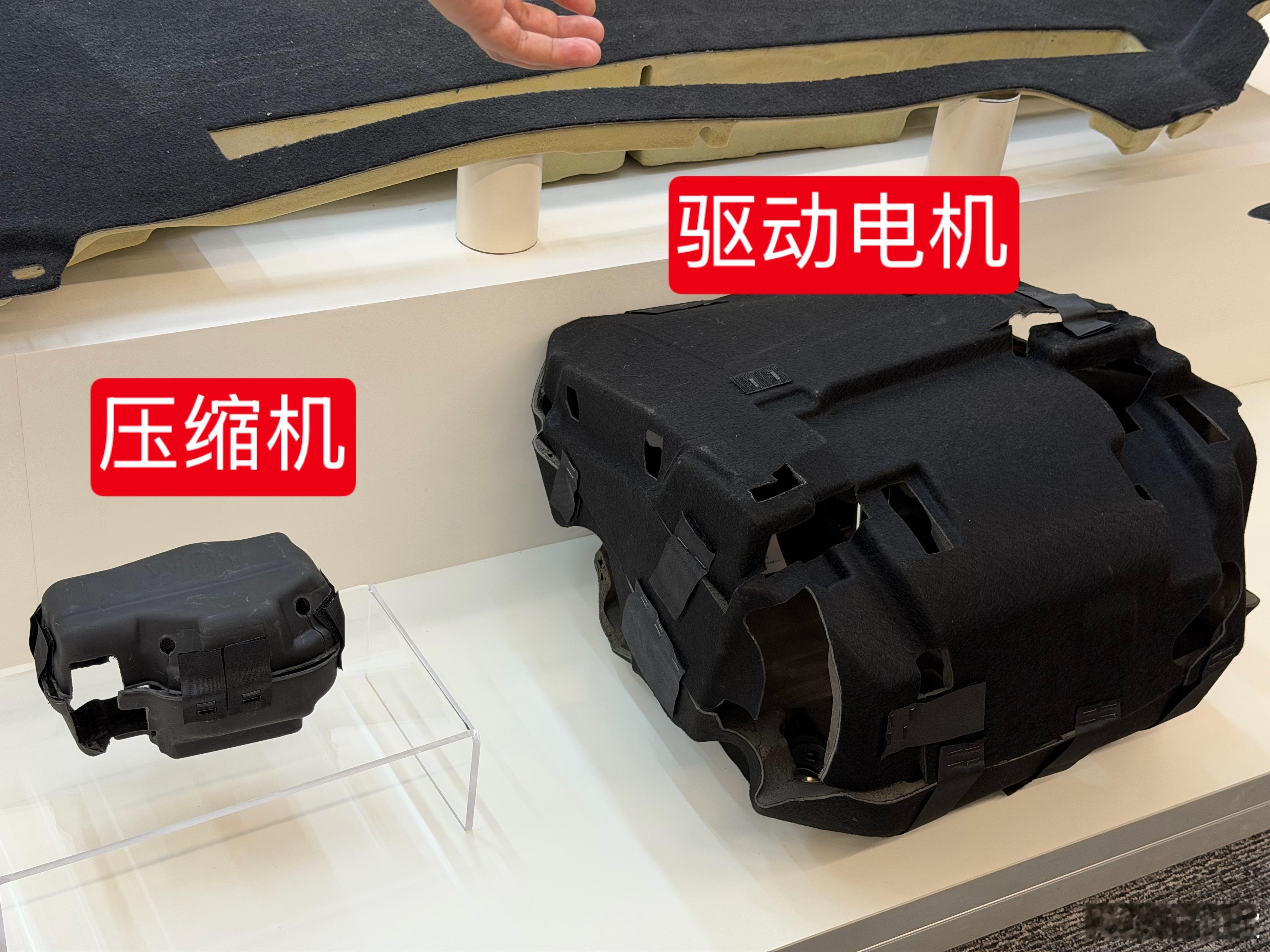 众所周知理想的NVH一直做的非常好,但是并不是简单的堆料方案的大致方向采用的是隔+消的形式,在噪音大的区域,比如车轮处,会精准定位噪音的最主要区域,去做一个强化的消声处理还有理想汽车声学部件的创新设计上,主要是两个:1. 驱动电机隔音罩。采用上下分体穿戴式结构,通过包裹电机实现噪音隔绝,同时合并储物盒与声学件设计,减少零件数量并实现整车轻量化,这个在电机上的隔音结构从ONE上面一直沿用改善至今2. 冰箱压缩机隔音罩,开发穿戴式小包裹结构,结合散热孔与吸风风扇实现噪音隔绝与散热平衡。从我的老头金理想L9 开始就配备了2025理想材料研发成果大盘点
