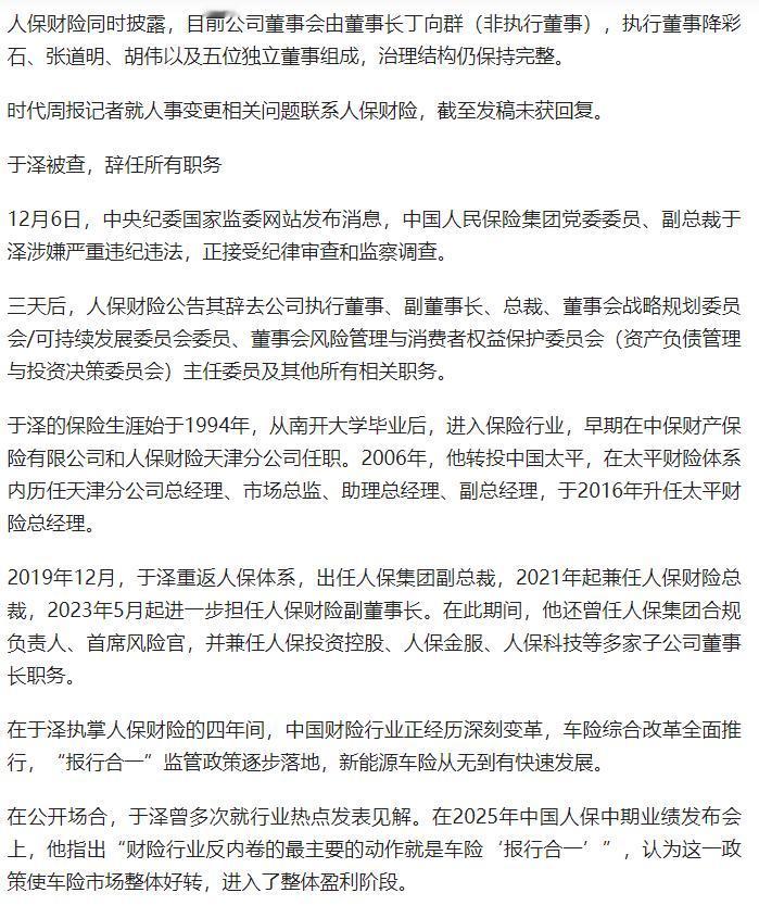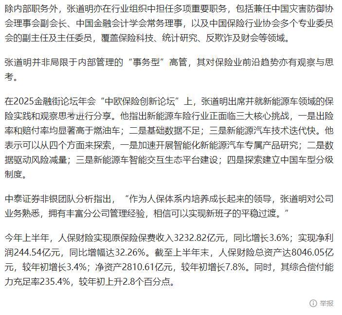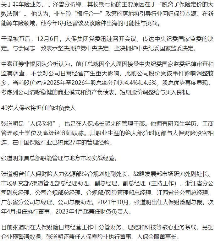 因原总裁于泽涉嫌违纪违法被查并辞任全部职务,49 岁人保老将张道明临危受命成为人保财险临时负责人,手握 8000 亿资产的财险巨头,在行业深度变革的关键节点,他能否带领公司平稳过渡并延续业绩增长势头? 原文来自:时代周报《8000亿人保财险换将!49岁副总裁张道明升任临时负责人,于泽辞任全部职务》