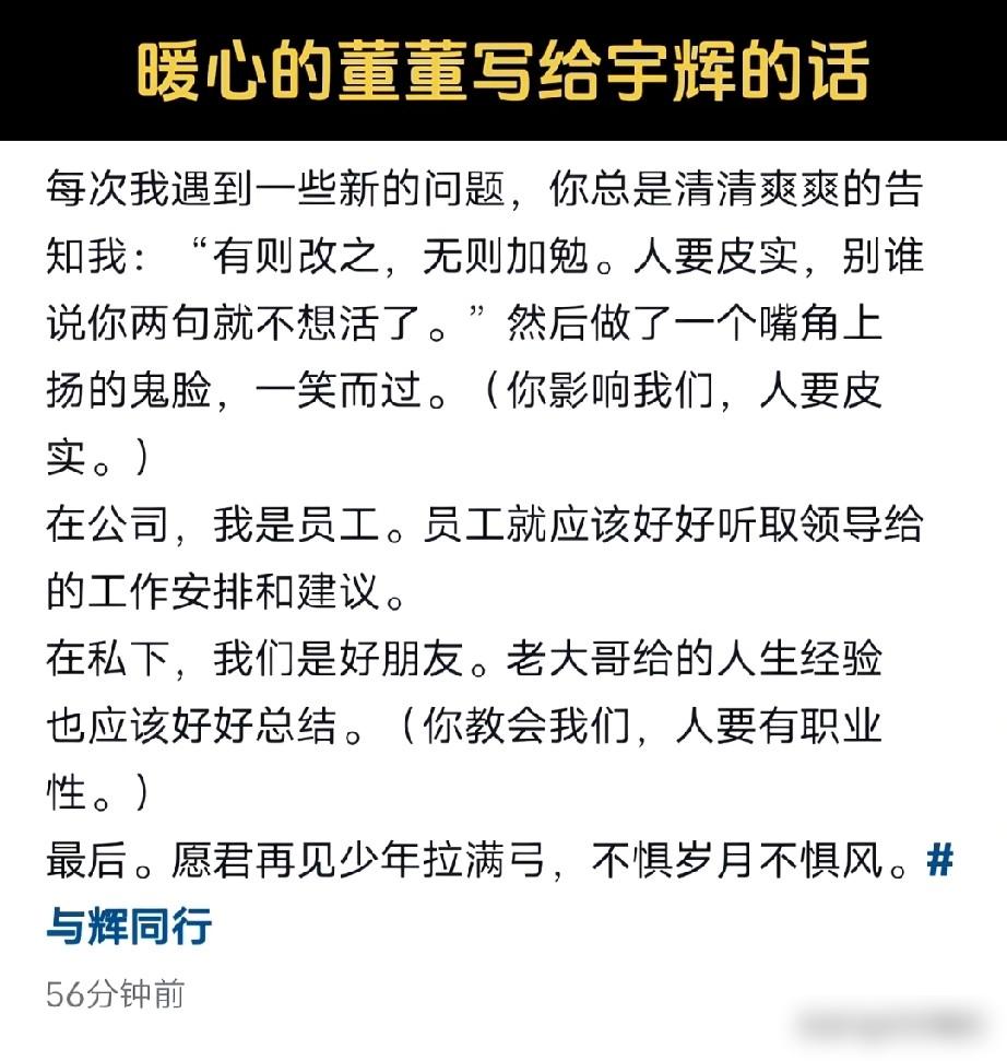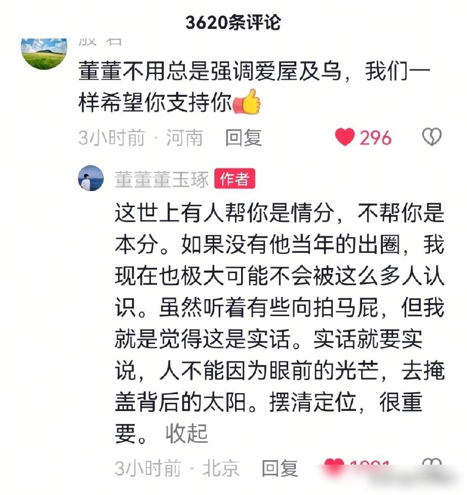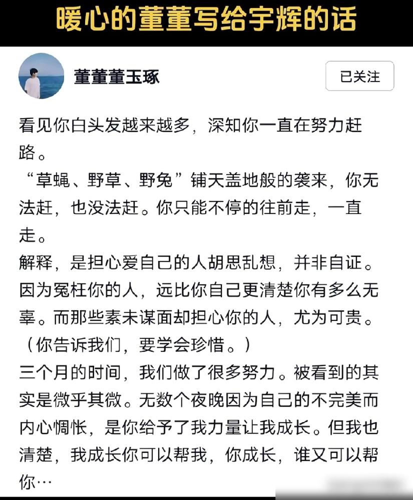 董董,原名董玉琢,22年成为某选主播,24年1月加入与辉同行,跟其他八位主播共同参与首播。 他出生于1996年,天津人,毕业于北京电影学院导演系,已与羊毛卷女士结婚,并育有一子,董礼貌。 那些曾经簇拥的鲜花与掌声,在那一刻显得如此脆弱。 也正是在这片看似无边的黑暗里,董董站了出来,如同一盏灯。 他的发声,不是经过精密计算的公关辞令,而是一个兄弟本能的选择。 那句“宇辉最懂得怎样把大家的钱放进自己的口袋,可是他从不这样做”,戳中了无数人的心。 这背后是超越商业利益的信任与懂得,是在流量为王的世界里,罕见的人情味儿。 有人嘲讽董董是“边角料”,质疑他的份量。 他们或许忘了,这个28岁的天津小伙,是凭真本事从北京电影学院导演系千军万马中杀出来的全国第三。 当年那届,只招10个男生,录取分数高过许多一本院校,那是智力与专业素养的双重硬核认证。 他的战场,从来不只是直播间那方小小的屏幕。 在东方甄选初创阶段,团队连基本的运营、场控都尚未健全,董董既是主播,又是运营,甚至还得亲自调试设备,给其他同伴做镜头前的专业培训。 这种从泥地里长出来的实战经验,让他对直播生态的每一个环节都了如指掌。 这份沉甸甸的资历,岂是“边角料”三个字可以轻飘飘抹杀的? 选择在风口浪尖上为宇辉发声,是一次极具风险的“仗义执言”。 商业世界向来现实,明哲保身才是多数人的首选。 董董不是不懂,但他更看重的是道义与是非。 那个最终被举报下架的视频,恰恰成了他侠肝义胆的勋章。 他不是冲动,而是清楚地知道,有些话必须有人说。 这种“不惹事,但绝不怕事”的担当,源自他内心稳固的价值坐标。 当宇辉提出“最有效的回应是沉默与无视”时,董董用行动诠释了另一种支持,我或许无法让噪音消失,但我会让你知道,你不是一个人在战斗。 这种情谊,最终沉淀为“与辉同行”最坚实的基石。 一群高材生,放弃看似更安稳的路径,在这里摸爬滚打,图的是什么? 不仅仅是商业成功,更是在追寻一种志同道合的认同感。 董董的追随,并非盲目,而是基于对宇辉人品与价值观的深度认同。 他看到了宇辉身上那种“不把粉丝当韭菜”的克制与善良,也认同“互相搭台,好戏连台”的团队哲学。 他们的合作,是才华与品格的相互吸引,是理性选择后的情感归宿。 时间会证明,什么才是真正有价值的东西。 浮夸的流量终会退去,而真诚、专业与担当,却会如美酒,愈陈愈香。 董董的存在,就像一块温润的玉,不张扬,却自有其硬度与光泽。 他与宇辉的“金玉组合”,其价值不在于一时的话题热度,而在于他们共同展现了一种可能性,在喧嚣的商业世界中,依然可以坚持内心的准则,用才华和真诚赢得尊重。 这条路注定风雨兼程,但有这样的兄弟并肩,前路便有了光。 再回首时,这一切拼搏与坚守,都将成为故事里最动人的篇章。